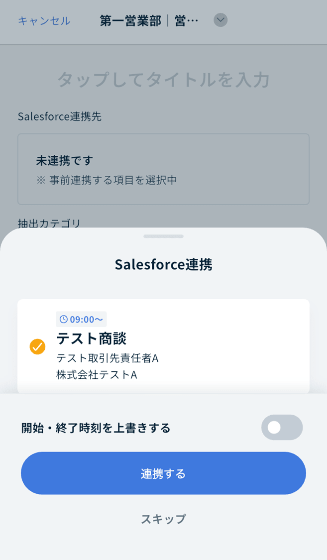 ※ サマリーもしくはすべてのCRM/SFA項目の要約結果が空欄だった場合、連携先のSalesforce行動を選択した場合であっても、記録終了後にSalesforce連携は行われません。