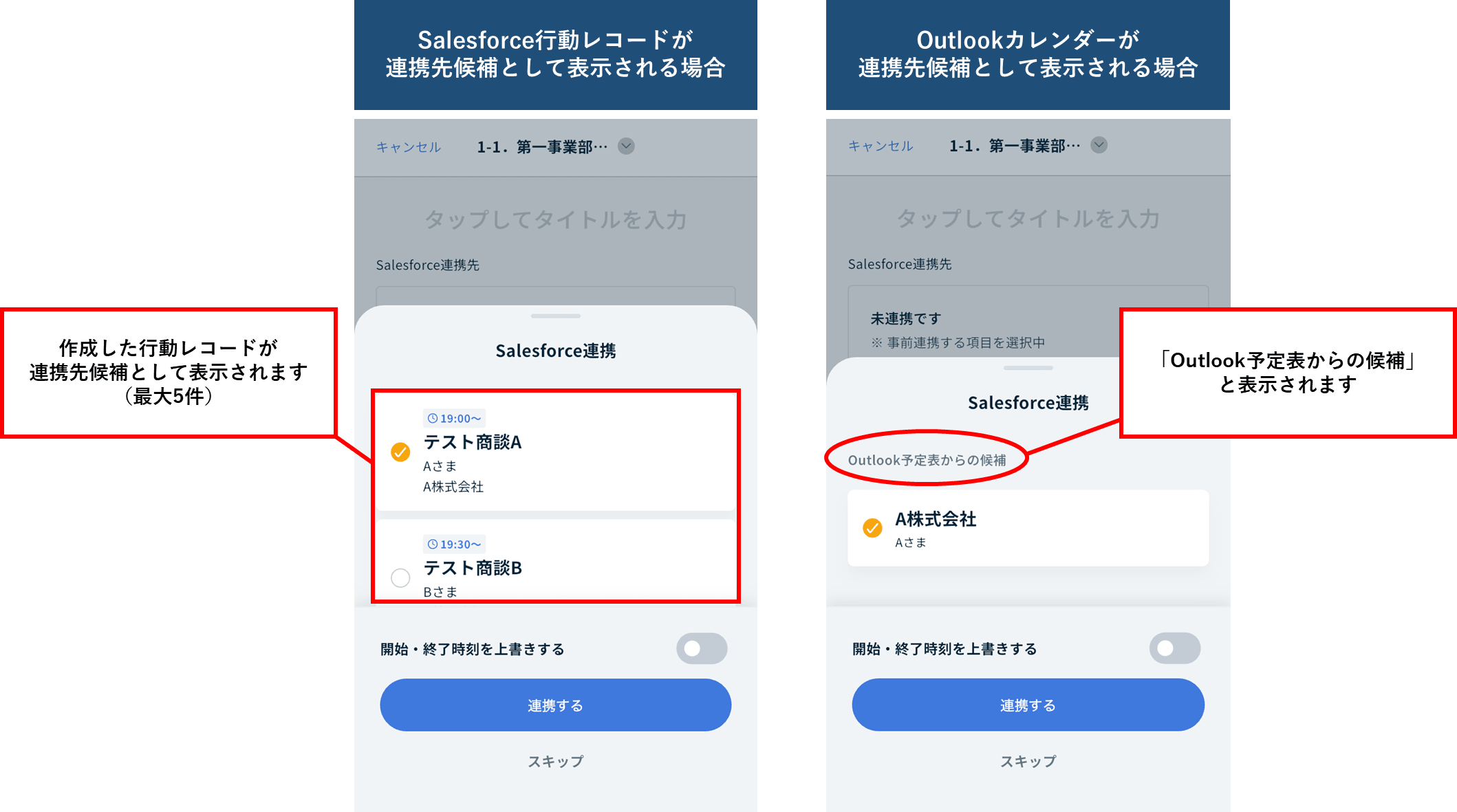 - >>Salesforce連携 - 使い方|記録開始時に連携候補を選択してSalesforceに連携する