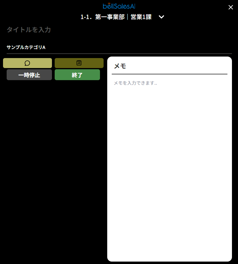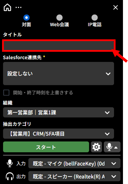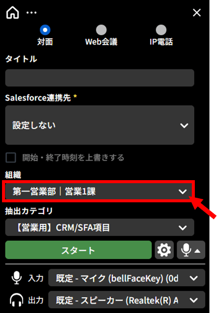 記録開始前に選択した抽出カテゴリ(CRM/SFA項目カテゴリ)が表示されます。