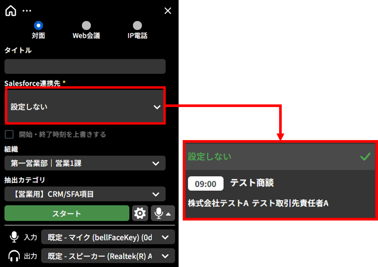 ※ 記録開始時に連携先行動を選択する場合、「名前」「関連先」の選択はできません。必要に応じて、Salesforce行動画面にて「名前」「関連先」を選択してください
