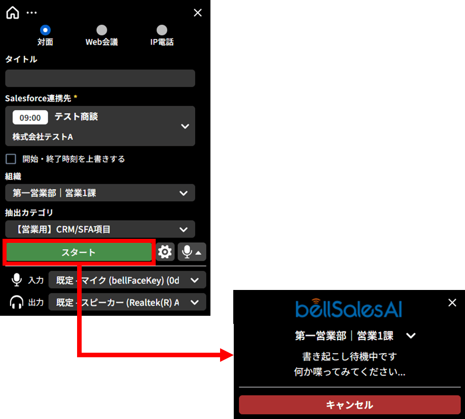 [スタート]をクリックすると、書き起こし待機ウィンドウに切り替わります。
