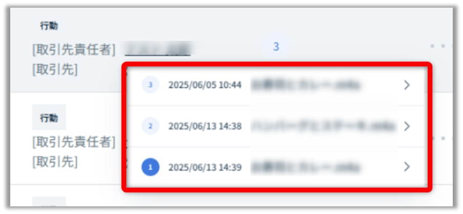 - スマホ上でログ一覧からレコード先(Salesforceページ)や[行動][名前][関連先]が同じログへ遷移するには、ログ詳細のSalesforce連携情報をご確認ください。