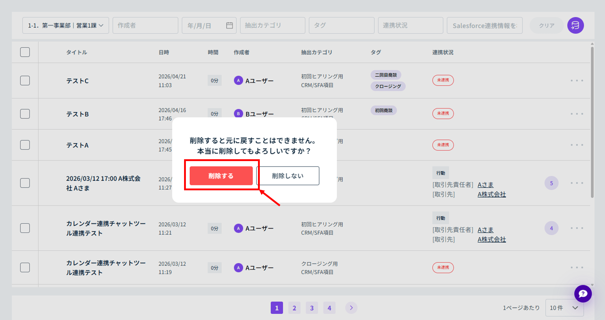削除の確認ウィンドウにて、[削除する]をクリックし削除は完了です。