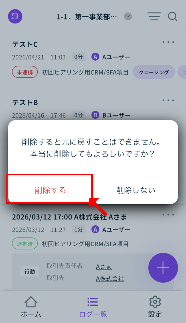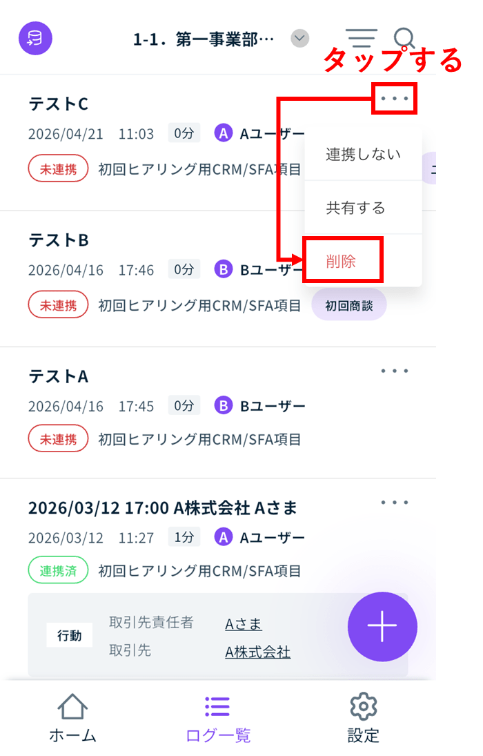 各ログの右側にある[⋯]をタップし、[削除]を選択します。