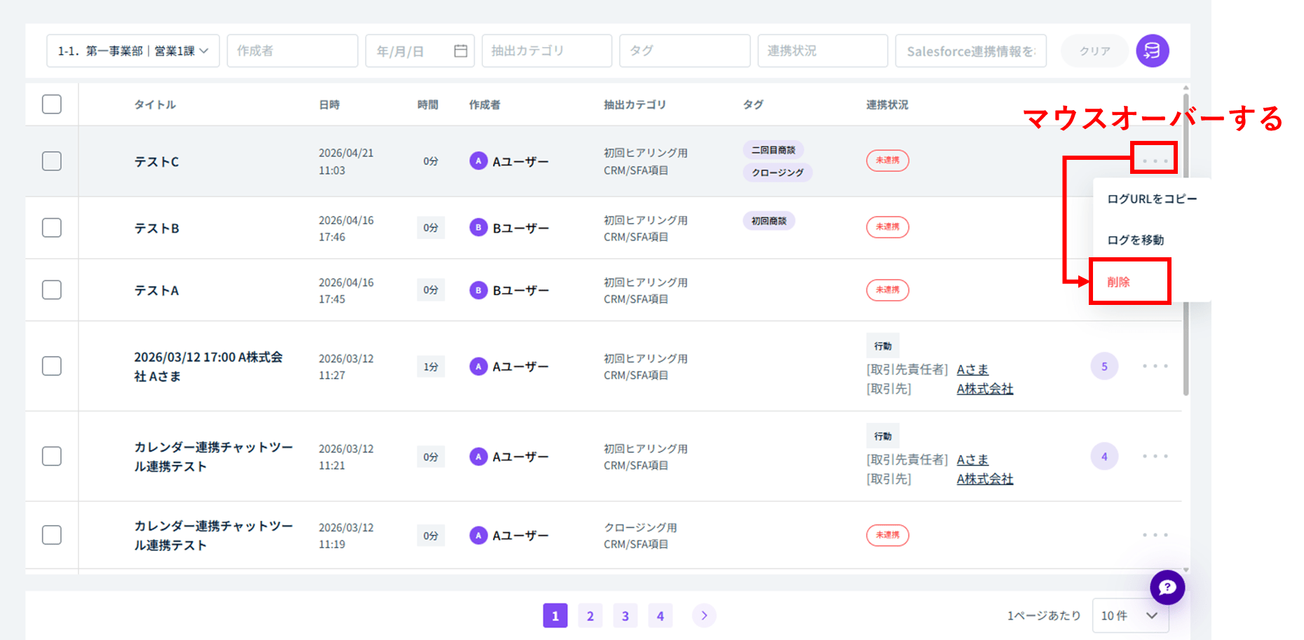 各ログの右側にある[⋯]にマウスオーバーし、[削除]を選択します。