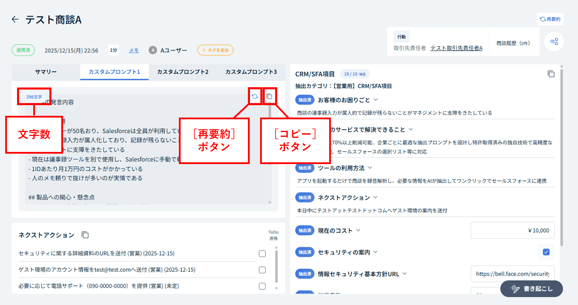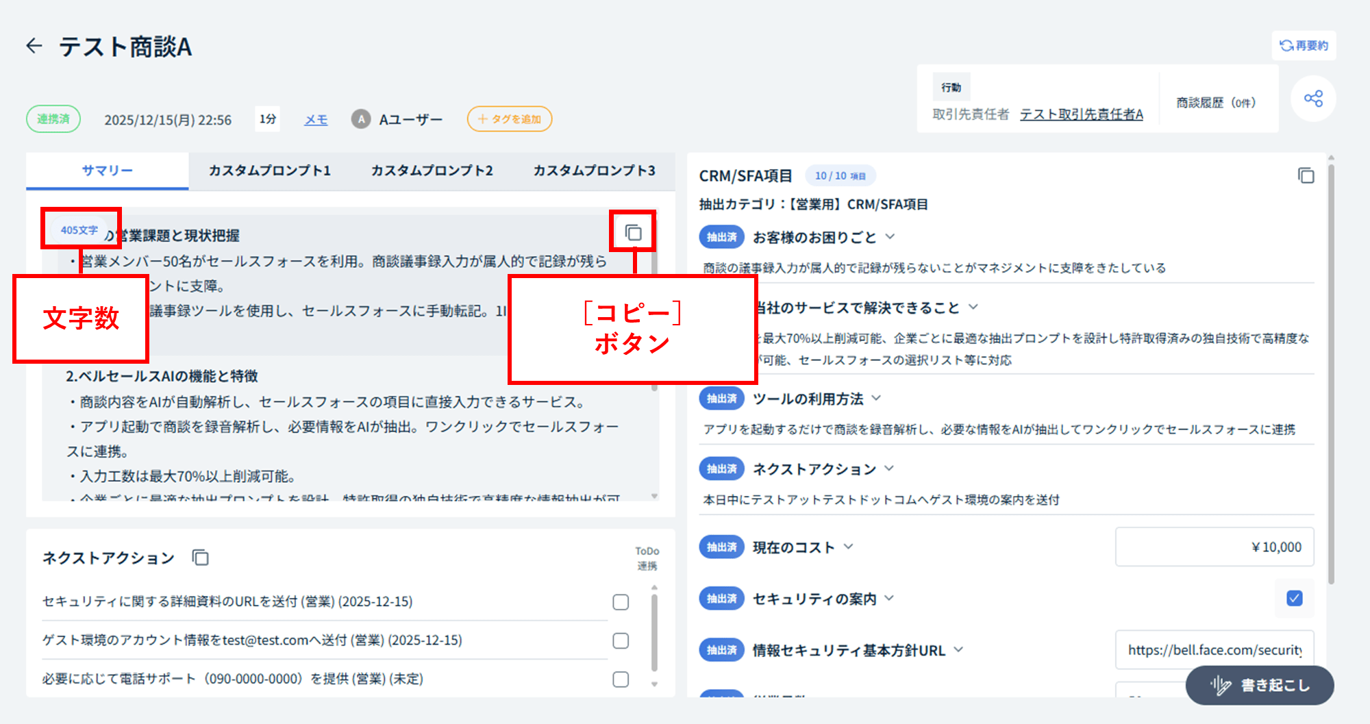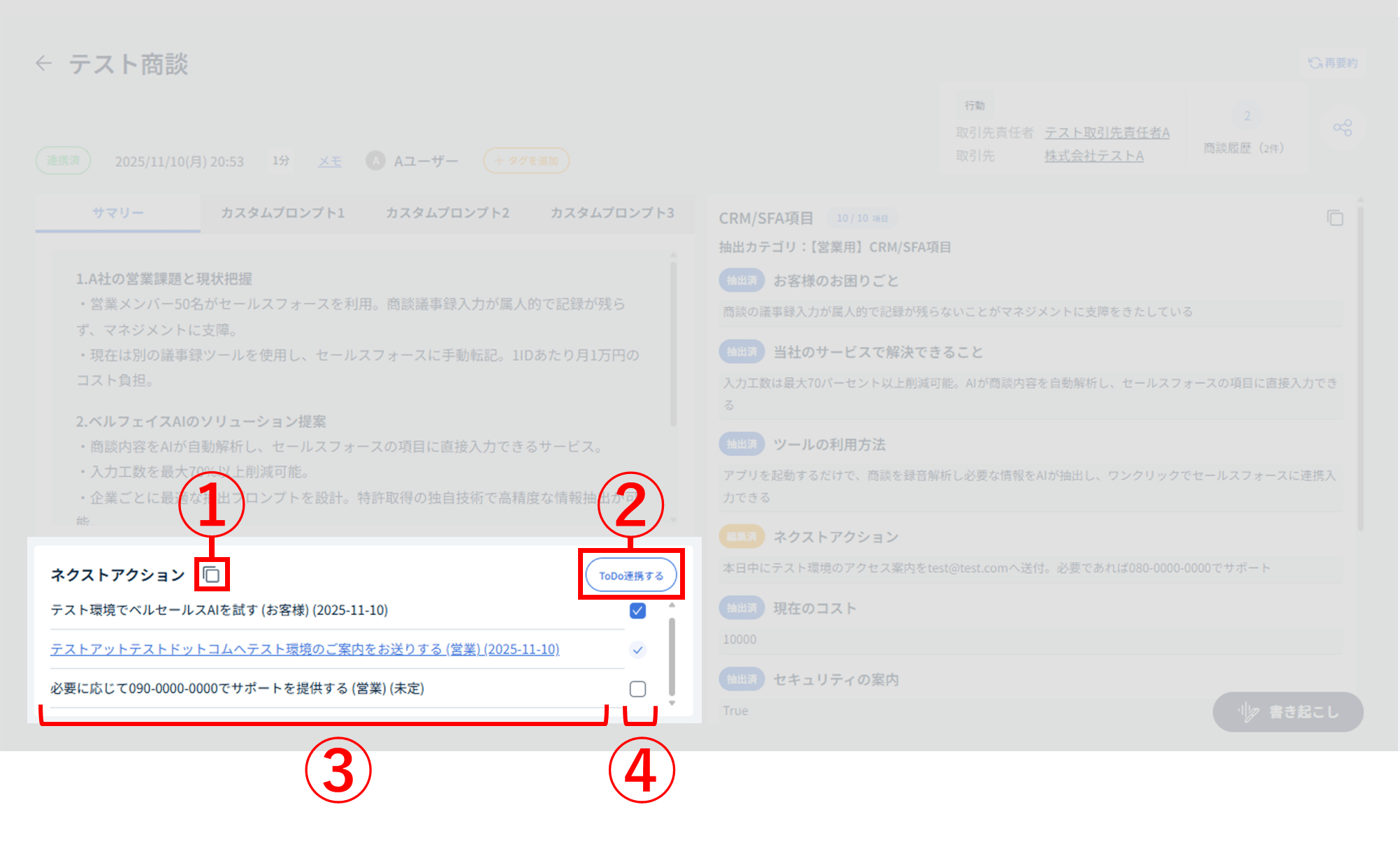 - 要約サマリーから抽出されたネクストアクションが表示されます。