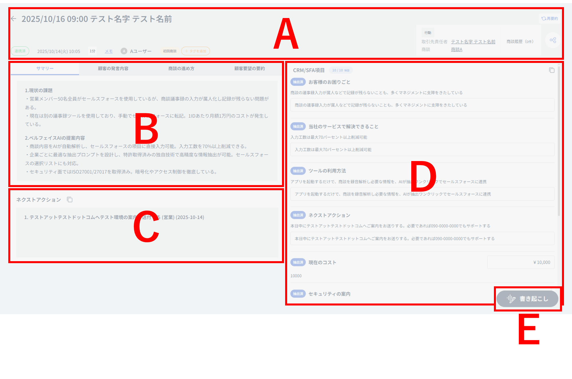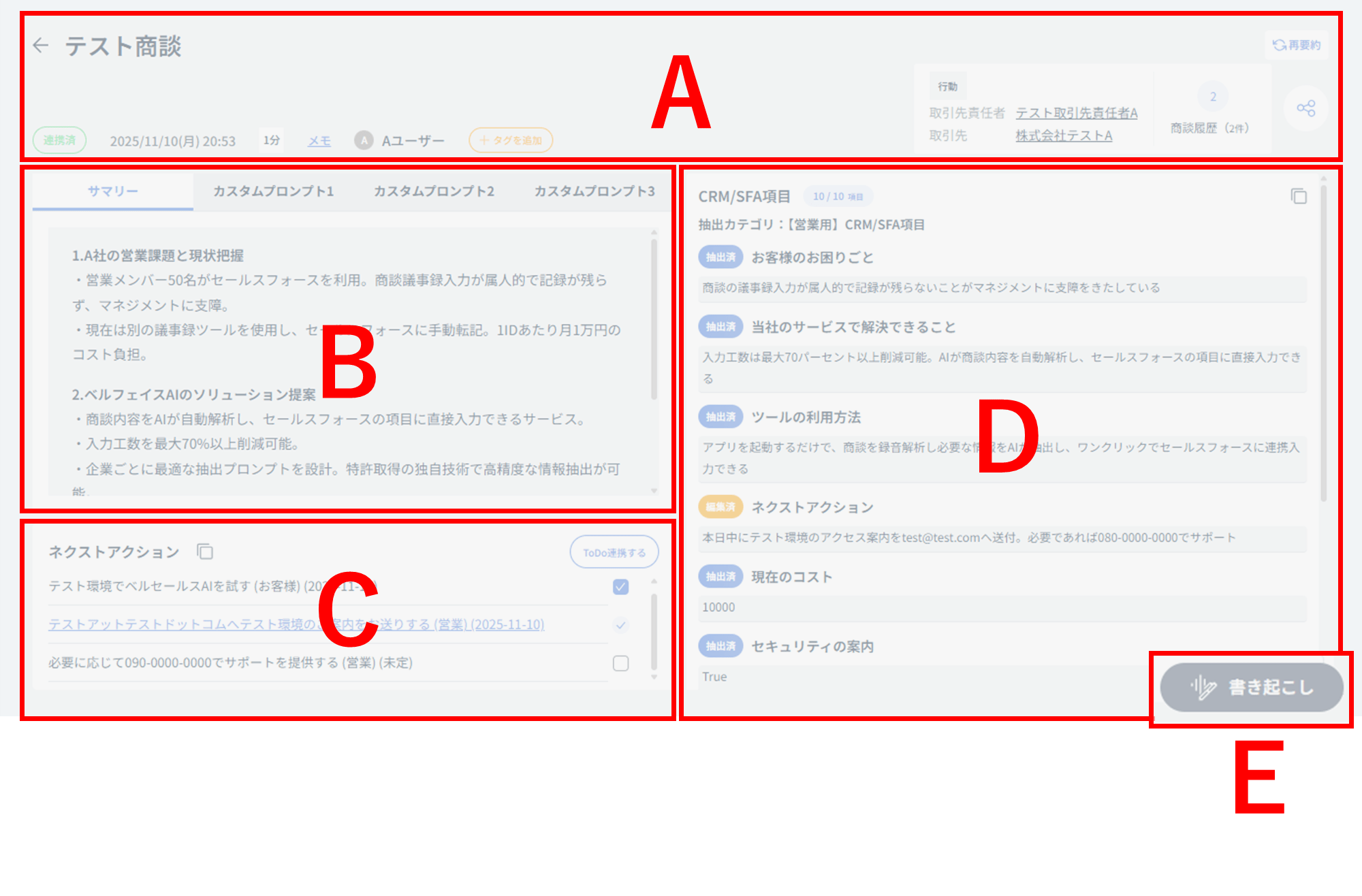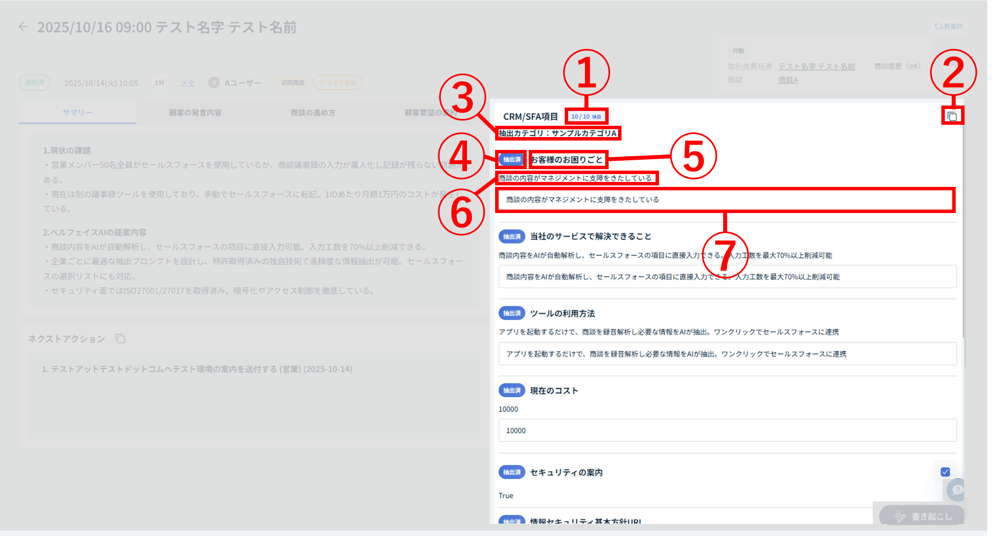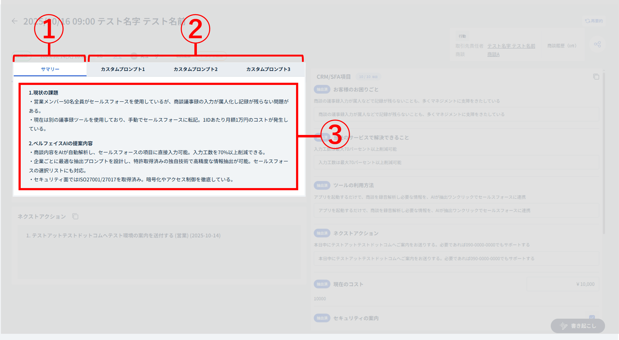 ⑩:[CRM/SFA項目][ネクストアクション][サマリー][書き起こし][カスタムプロンプト]タブ