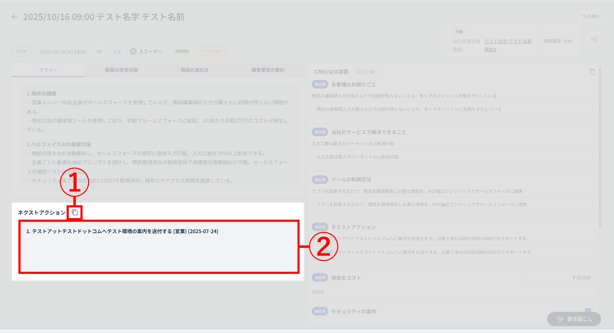 「ネクストアクション」には、書き起こしテキストから抽出したネクストアクションが表示されます。