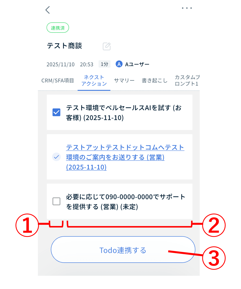 - [ToDo連携する]ボタンクリックにて、チェックを入れたネクストアクションをToDo連携することができます。