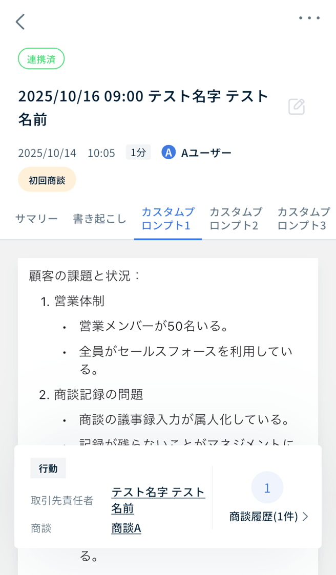 - カスタムプロンプトの要約が未実行の場合は[サポートを実行する]ボタンが表示され、タップにて要約内容を確認することができます。