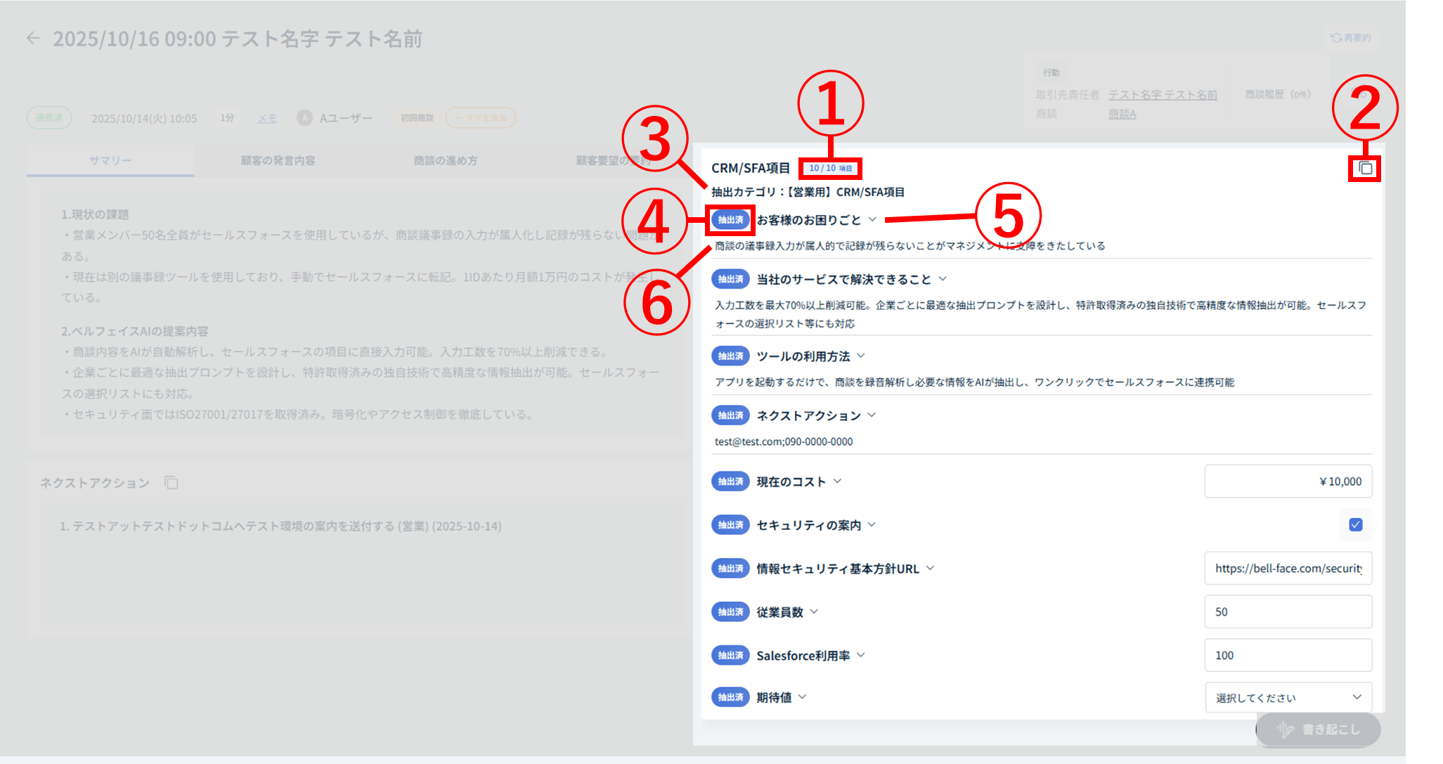 - 右側のトグルより書き起こしテキストの要約が完了した際に抽出されたデータを表示することができます。(「Salesforceデータ型変換」機能オプションご利用環境のみ)