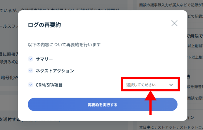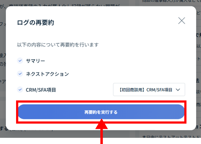 ※ 無選択のまま再要約を実行した場合、該当のログが属する組織におけるデフォルト設定のCRM/SFA項目で再要約がおこなわれます。
