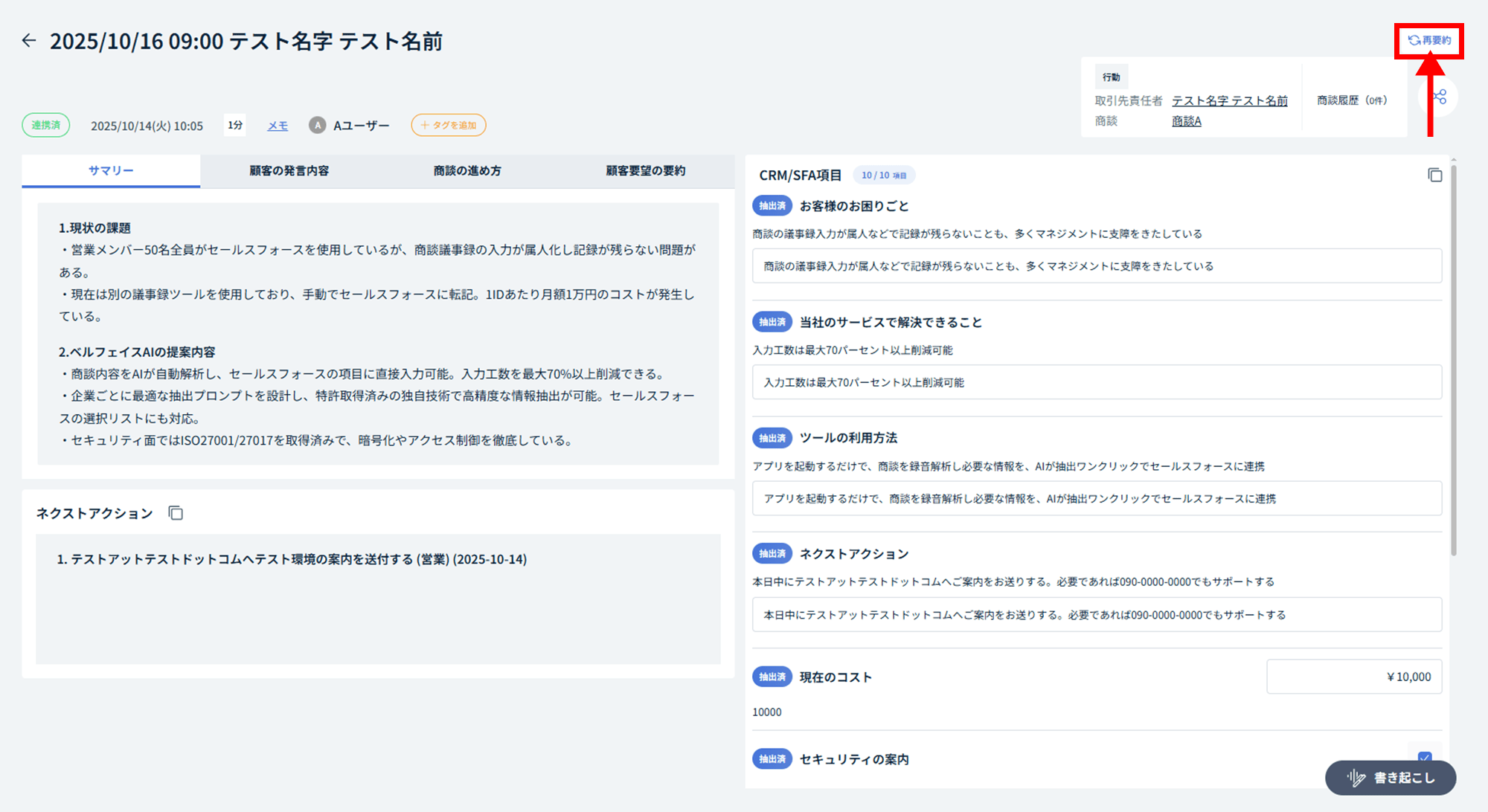 書き起こしテキストの修正やCRM/SFA項目を編集した場合などに、変更内容を反映した要約を再生成することが可能です。
