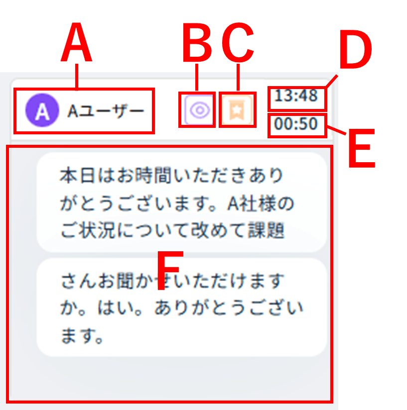 … 開始時刻からの経過時間が表示されます。 - F:書き起こし内容(トーク内容)