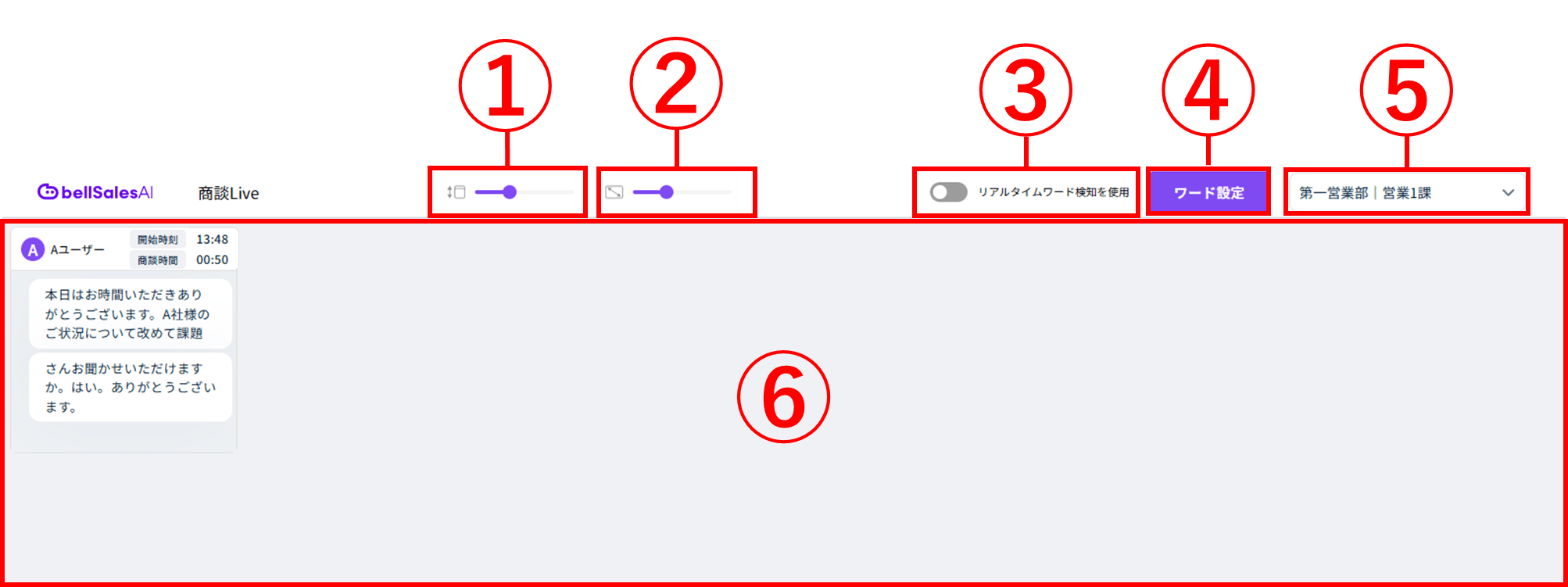 … 商談Liveを表示する組織を選択することができます。 - ⑥:トーク一覧