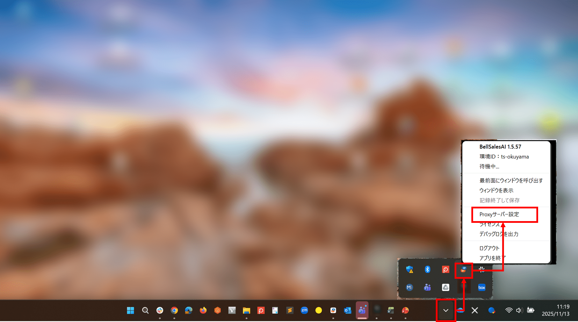 タスクトレイ内のアプリアイコンを右クリックし表示されるメニューより、「Proxyサーバー設定」を選択します。