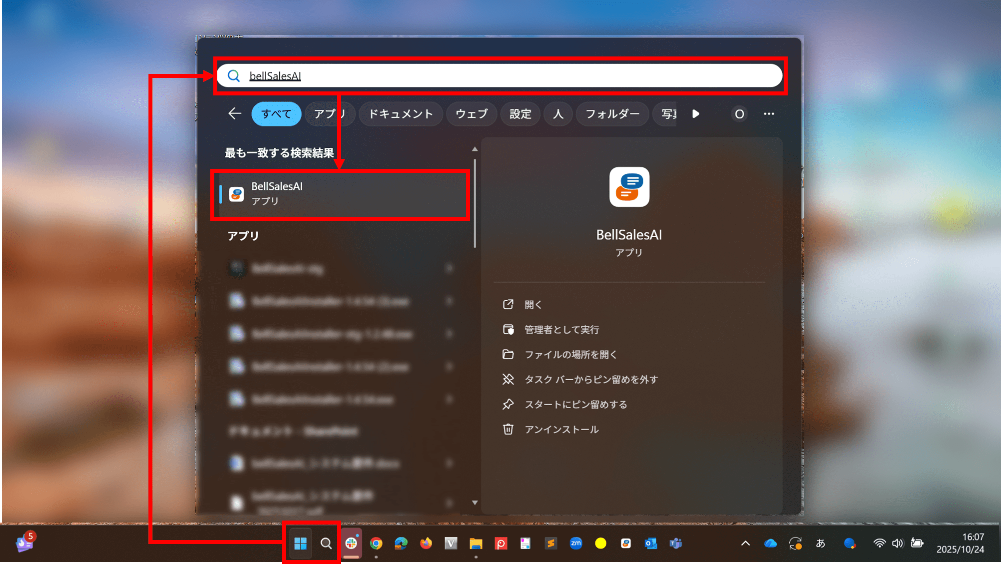 スタートメニューにて「bellSalesAI」と検索し、bellSalesAIアプリをクリックします。