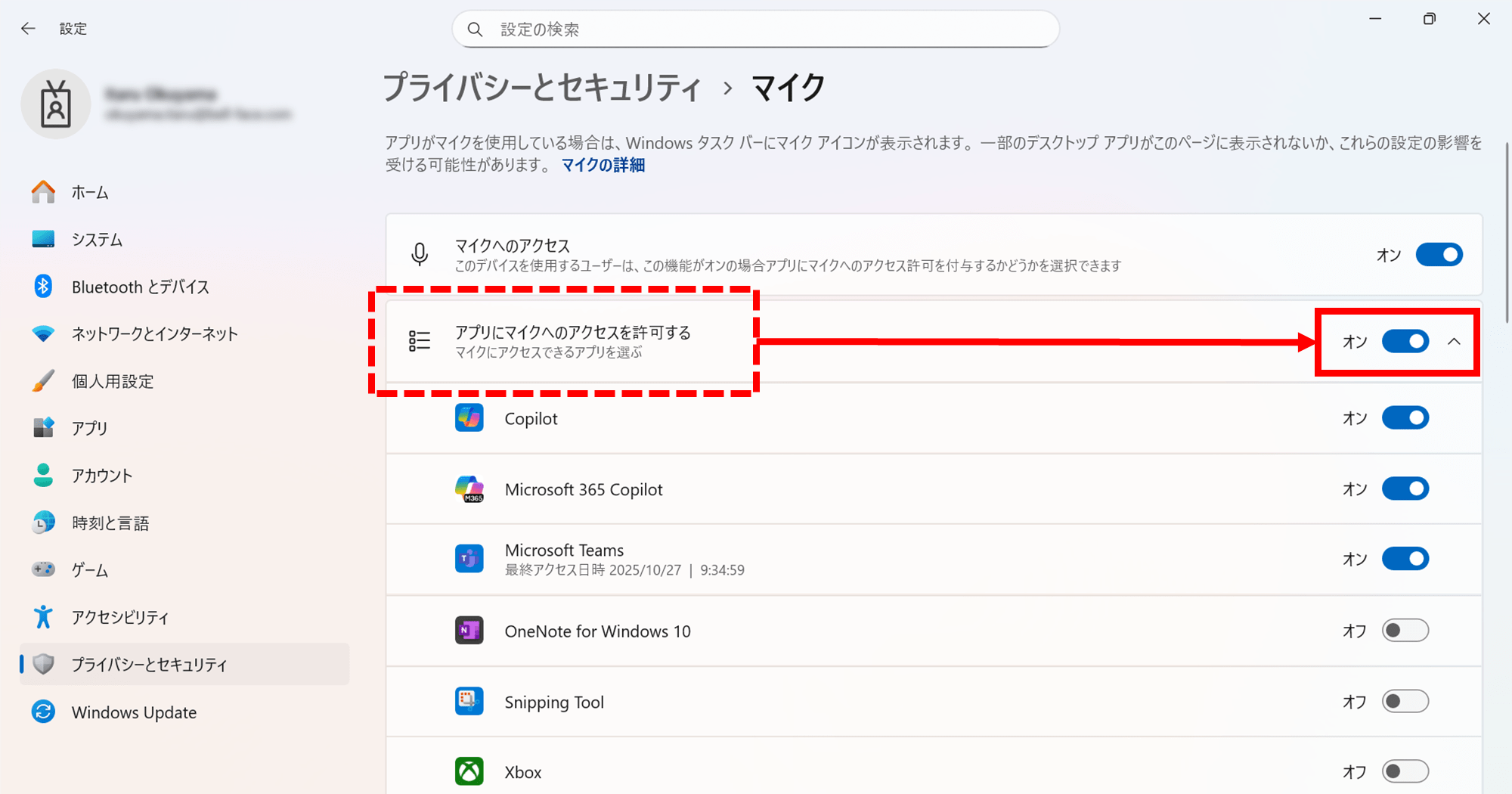 Windows[設定] > [プライバシーとセキュリティ] > [マイク]にて、「アプリにマイクへのアクセスを許可する」および「デスクトップ アプリにマイクへのアクセスを許可する」をオンにします。