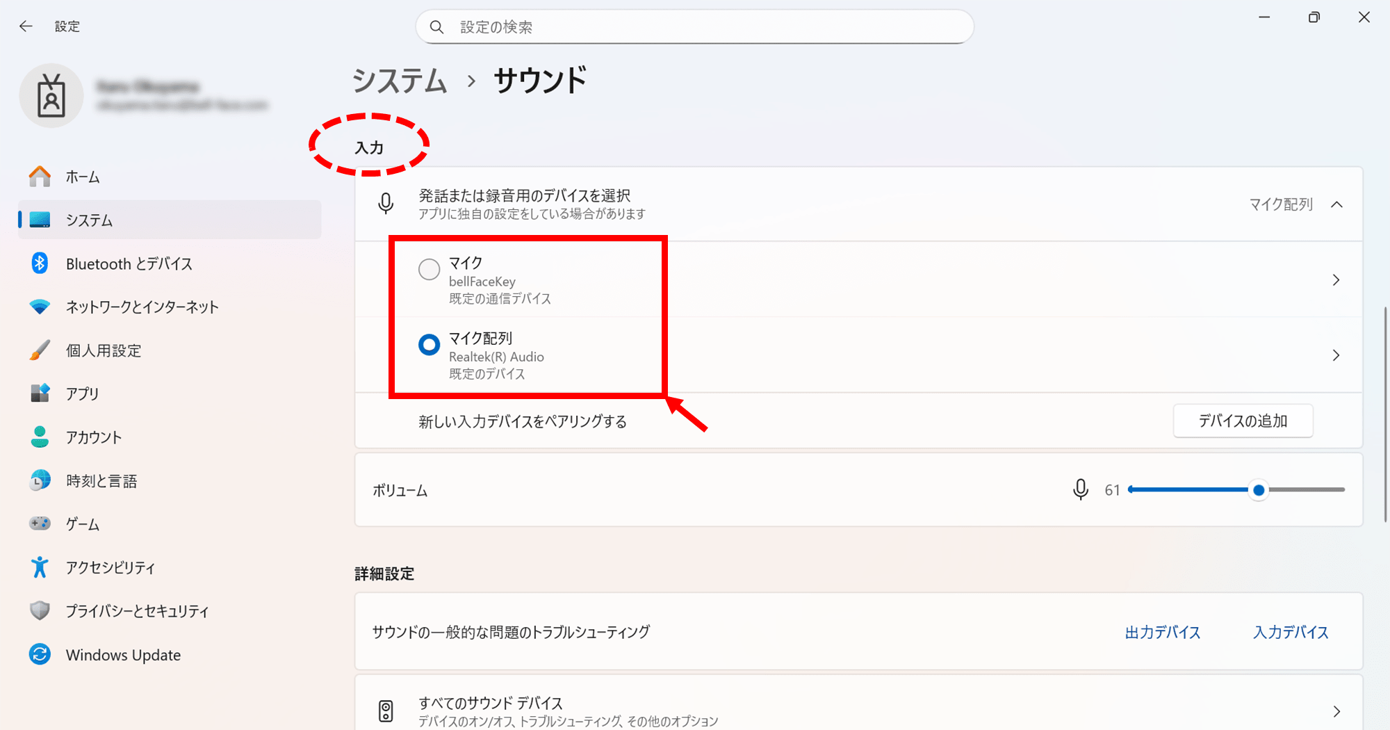 Windows[設定] > [システム] > [サウンド]にて、「出力」「入力」に記録で使用するスピーカー・マイクを選択します。