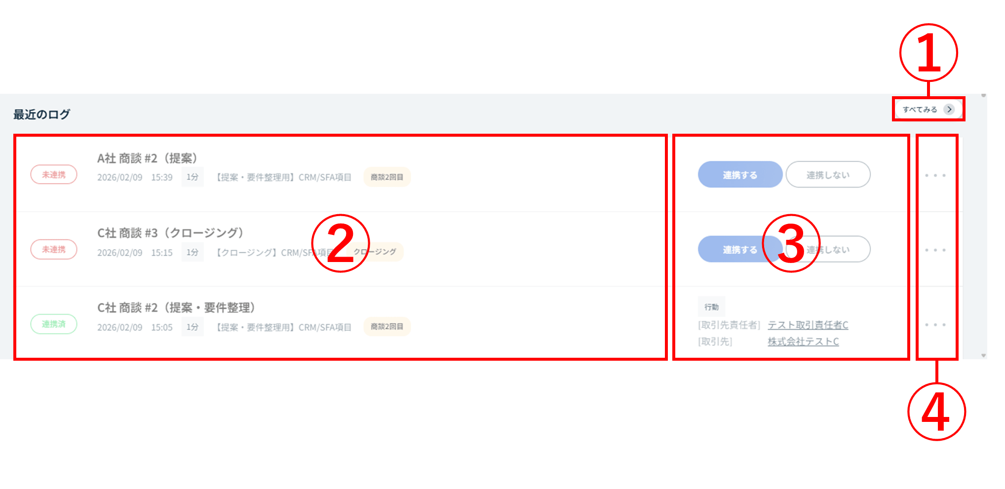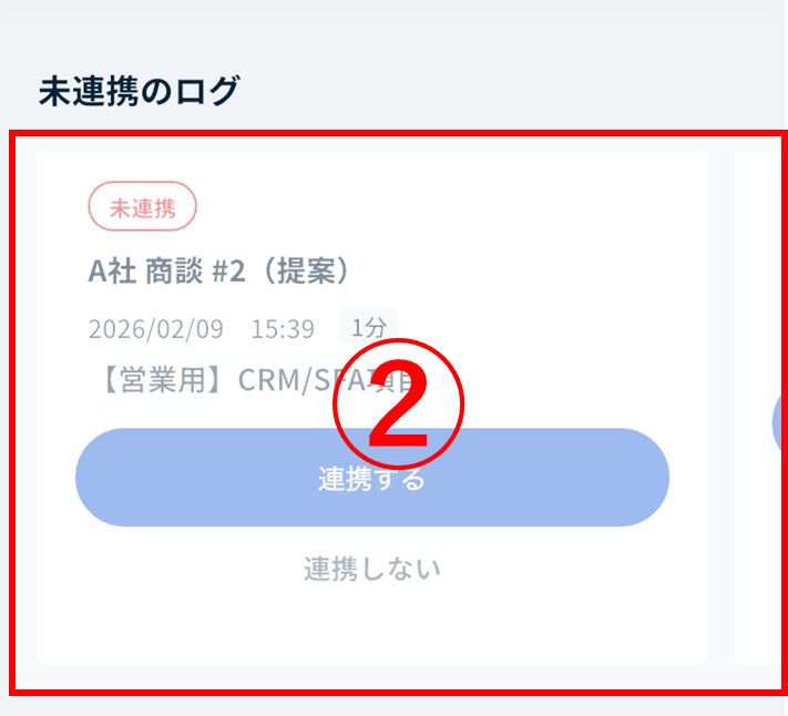 - 各ログの[連携する]ボタンをクリック/タップすることでSalesforce連携ウィンドウが表示され、連携処理をおこなうことができます。