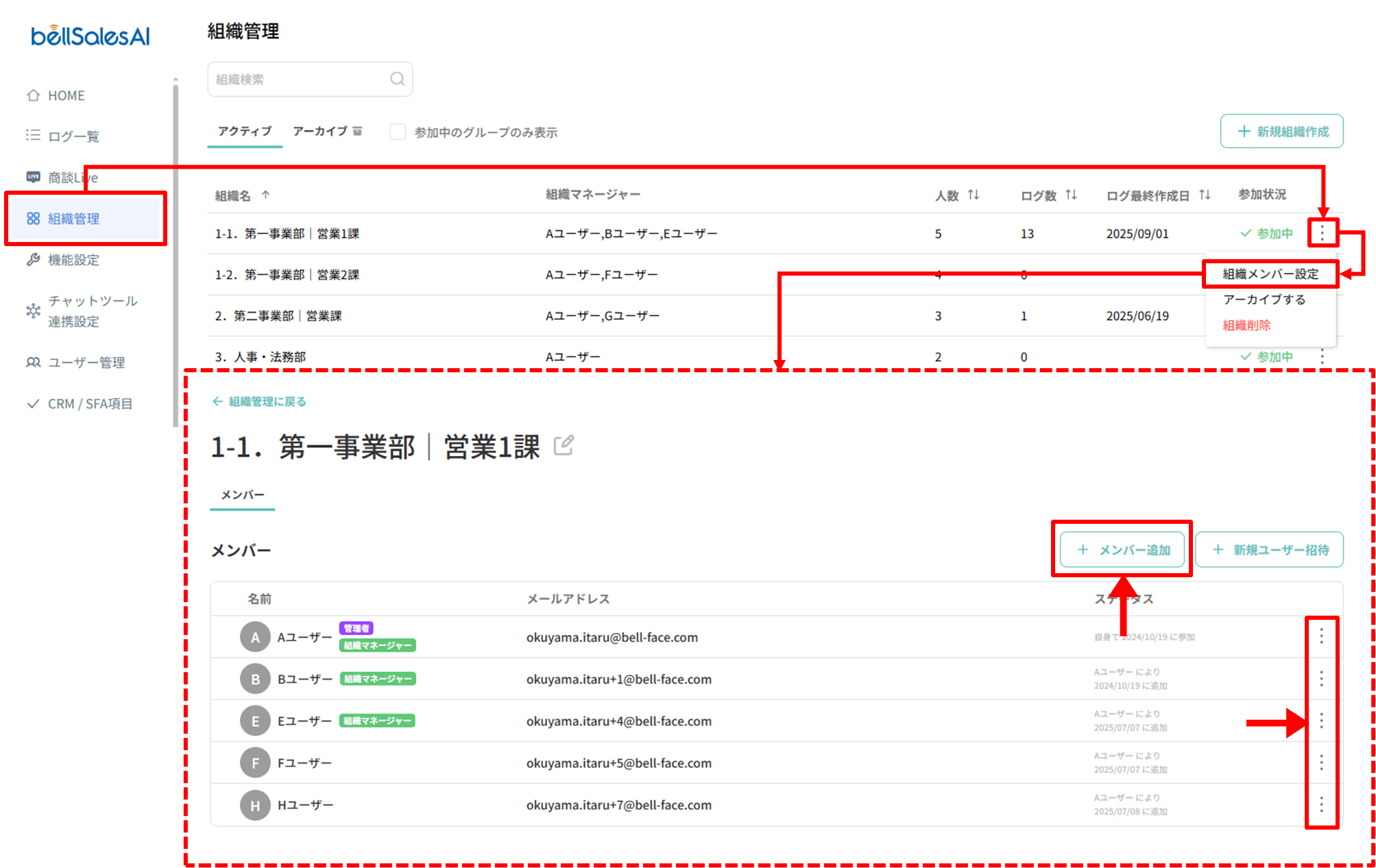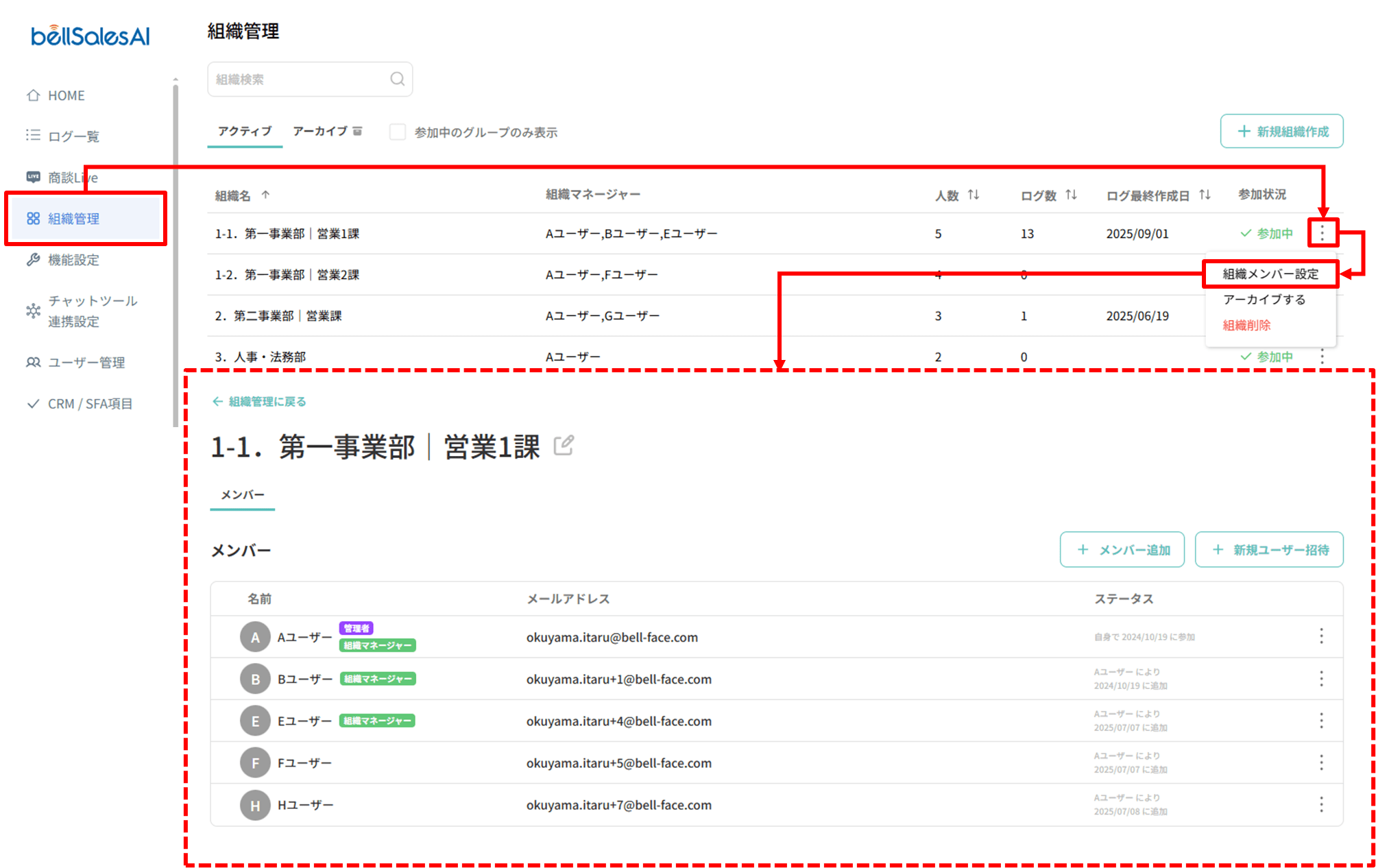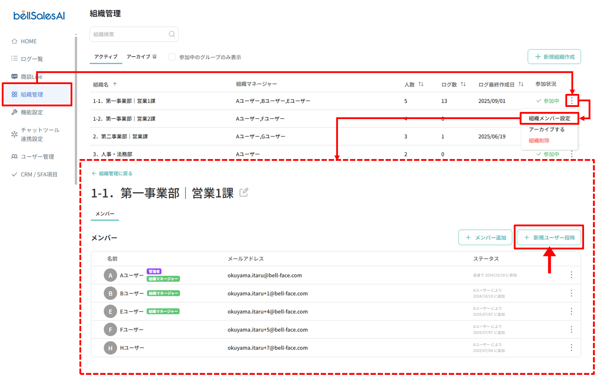 bellSalesAIの「組織管理」機能を使えば、組織へのメンバー追加・新規ユーザー招待・権限付与などを組織単位でスムーズに行えるようになり、管理工数がグッと軽くなります。