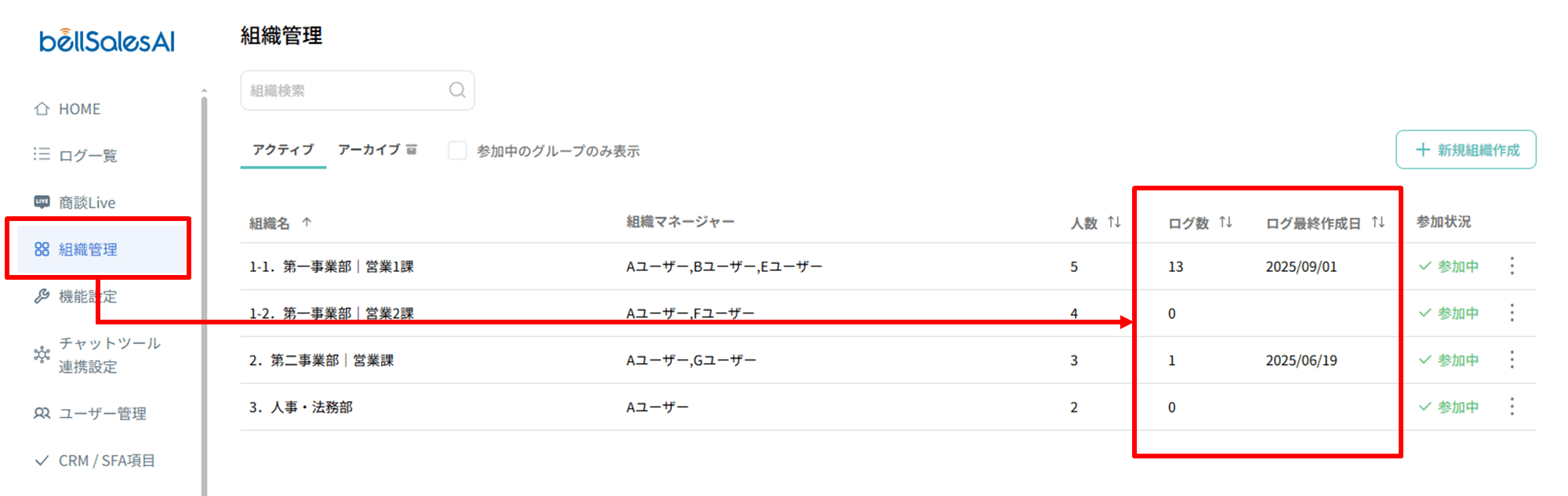 - 組織ごとに作成されたログ数やログの最終作成日を確認することができるため、bellSalesAIをあまり活用できていない組織を瞬時に把握することができます。