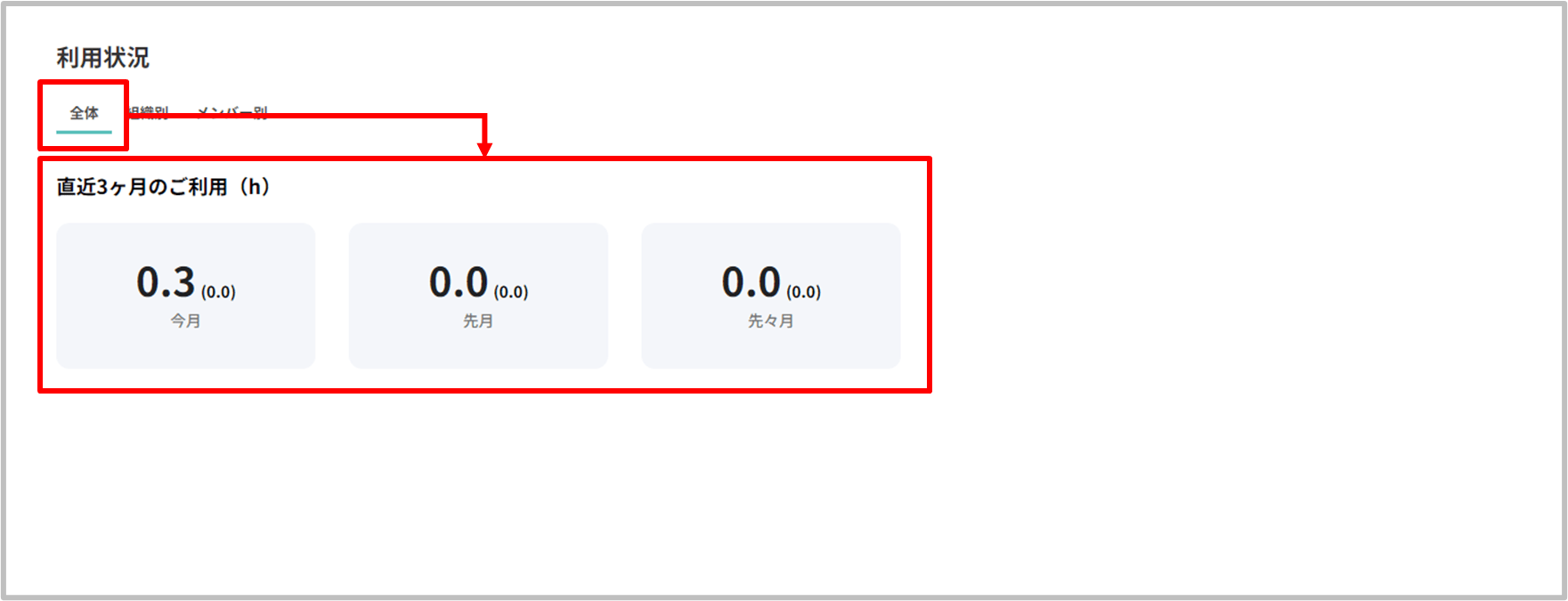 「利用状況」画面にて[全体]タブを選択することで、当月を含む直近3ヶ月の利用時間を確認することができます。