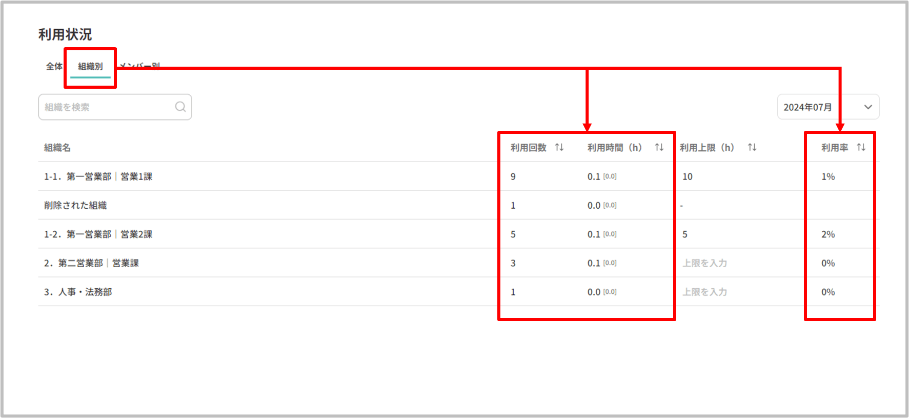 「利用状況」画面にて[組織別]タブを選択することで、各組織の利用回数・利用時間・利用率を確認することができます。