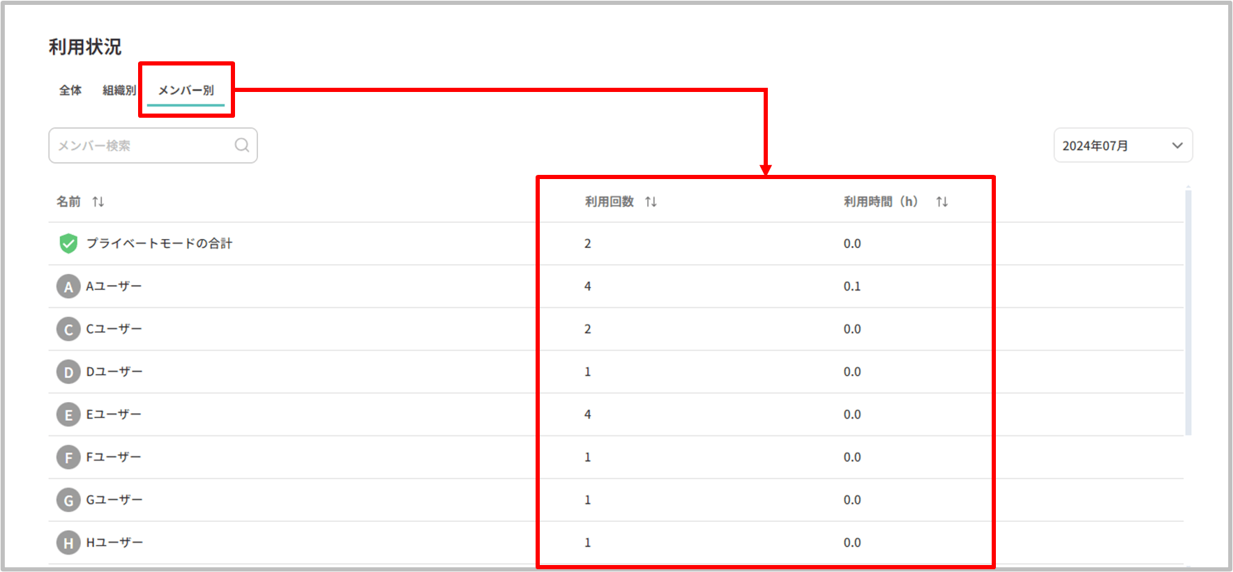 「利用状況」画面にて[メンバー別]タブを選択することで、ご利用環境の利用回数・利用時間を確認することができます。