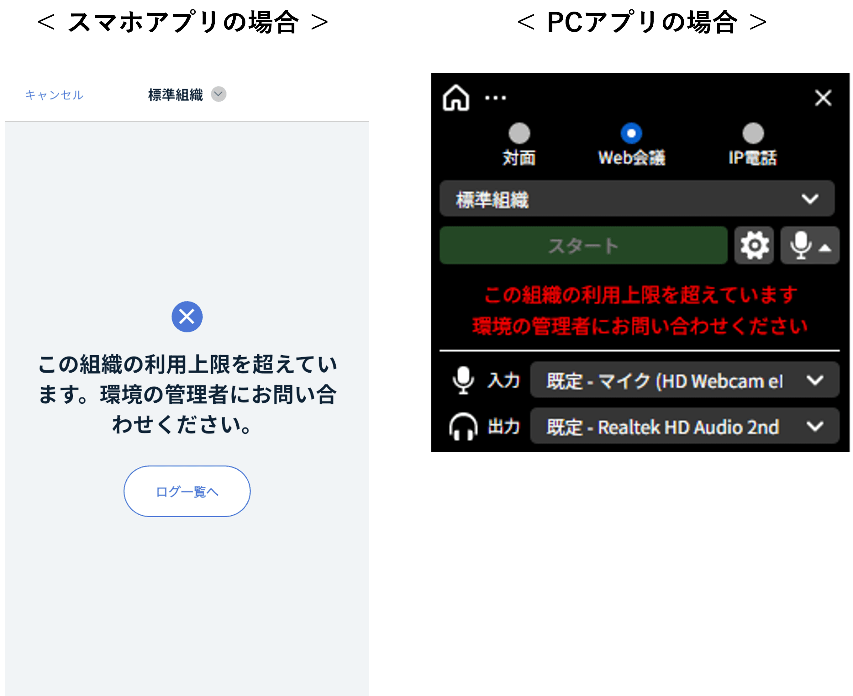 設定した利用上限を超過した場合、各アプリでは以下の表示がされます。