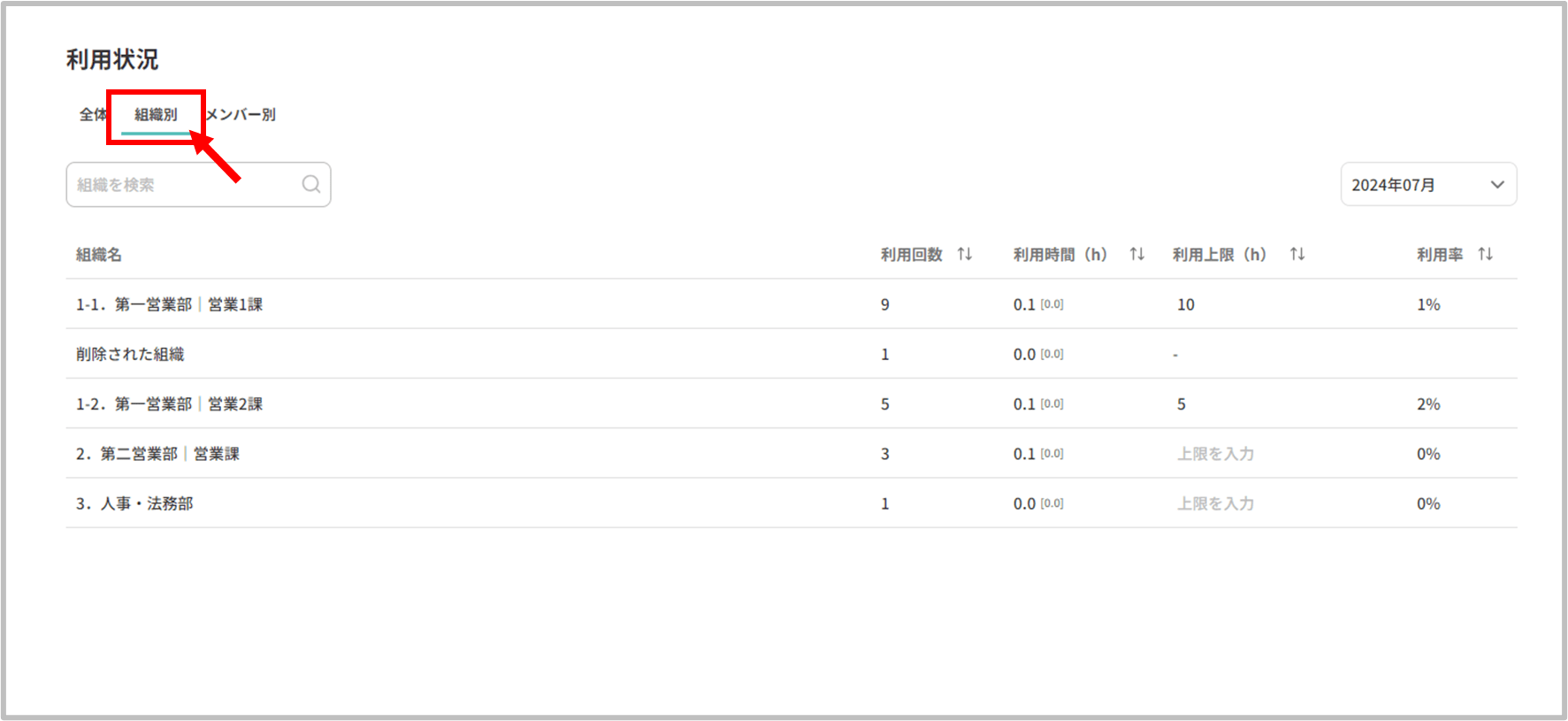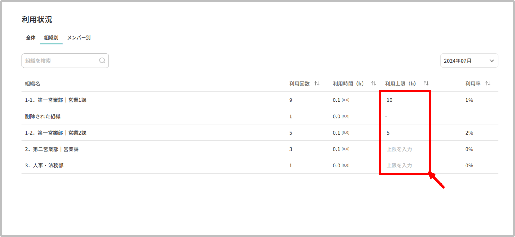 ここでは、[利用状況]で組織ごとの利用上限時間を設定する方法を解説します。