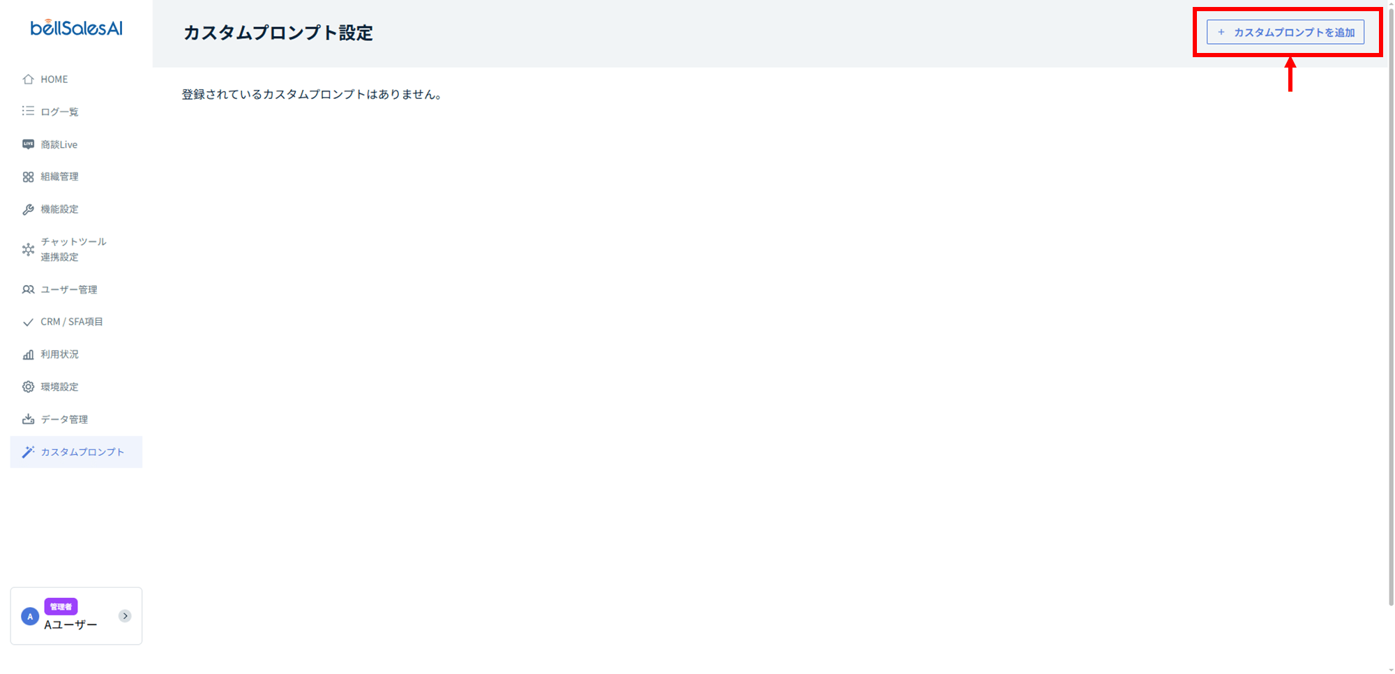 管理者アカウントにてPCブラウザでログインし、サイドメニュー > [カスタムプロンプト]を開きます。