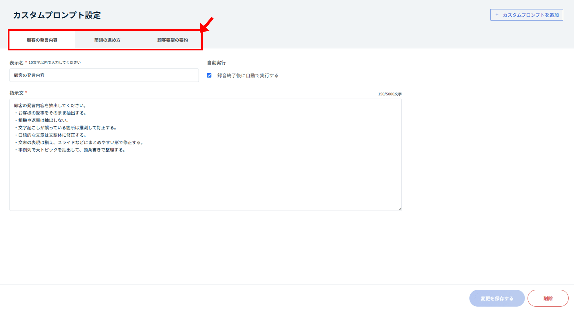 削除をおこなうカスタムプロンプトをタブから選択します。