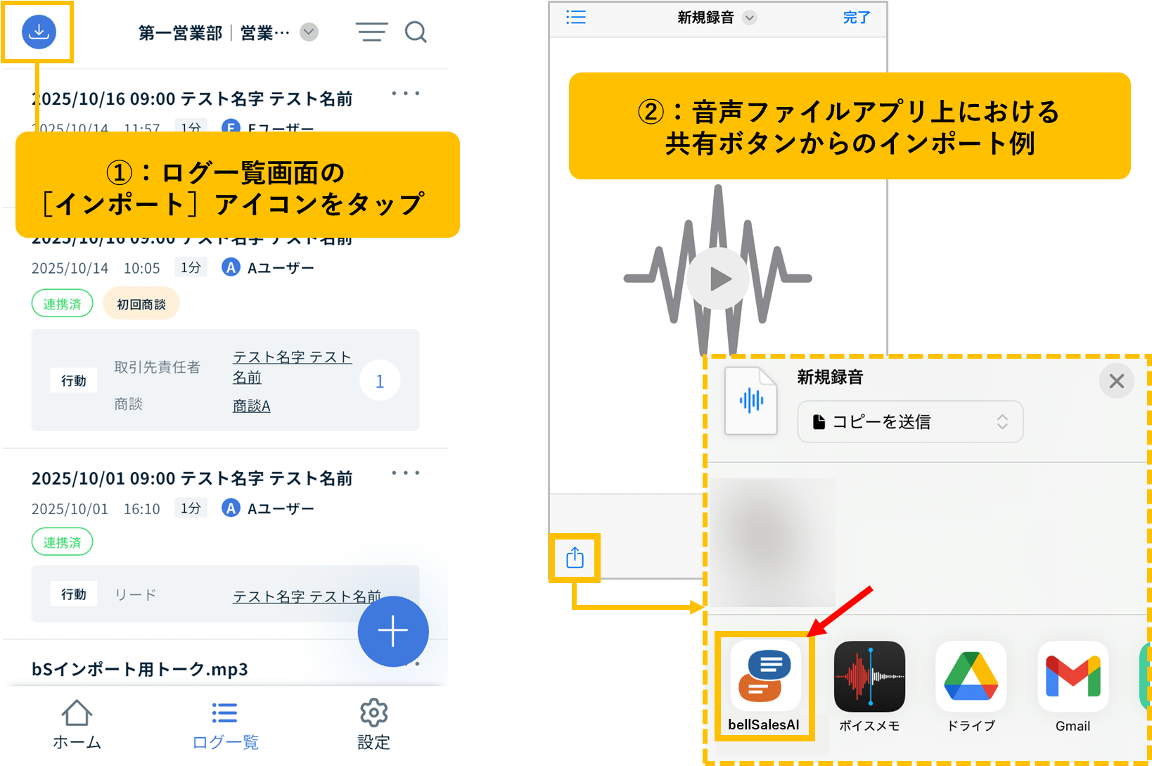 - ①:bellSalesAIスマホアプリの「ログ一覧」にて、[インポート]アイコンをタップ