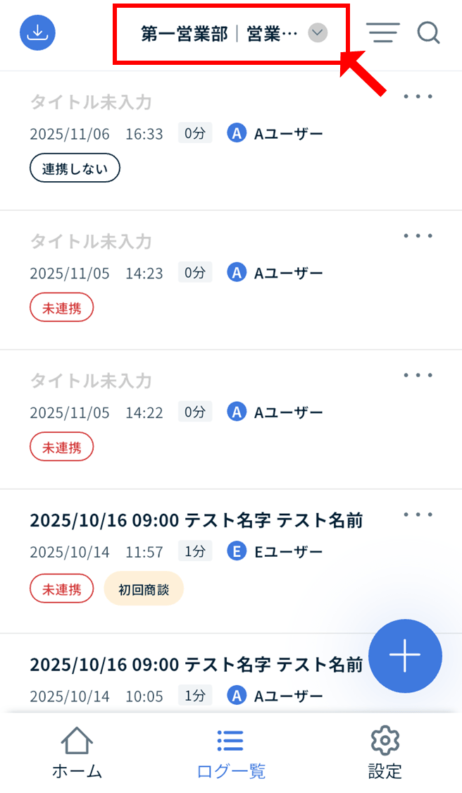 ログ一覧画面のヘッダーにて、インポートをおこなう(ログを作成する)組織を選択します。