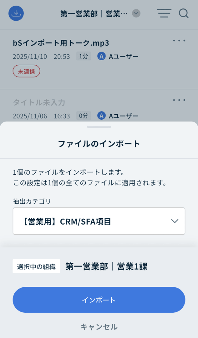 ログの抽出カテゴリ(CRM/SFA項目)を選択し、[インポート]をクリック/タップします。
