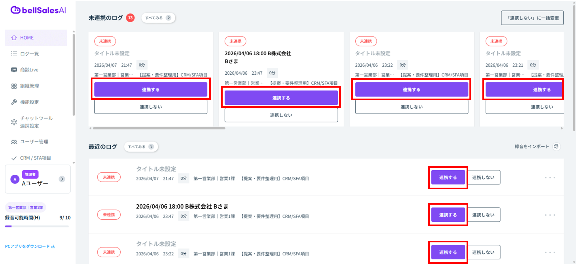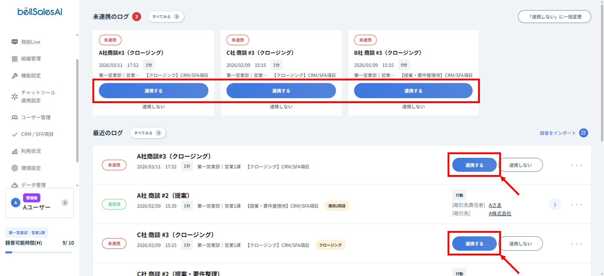 ※ 1度ログをSalesforceと連携(紐付け)した場合、bellSalesAI側で修正や連携のしなおしをすることはできません。