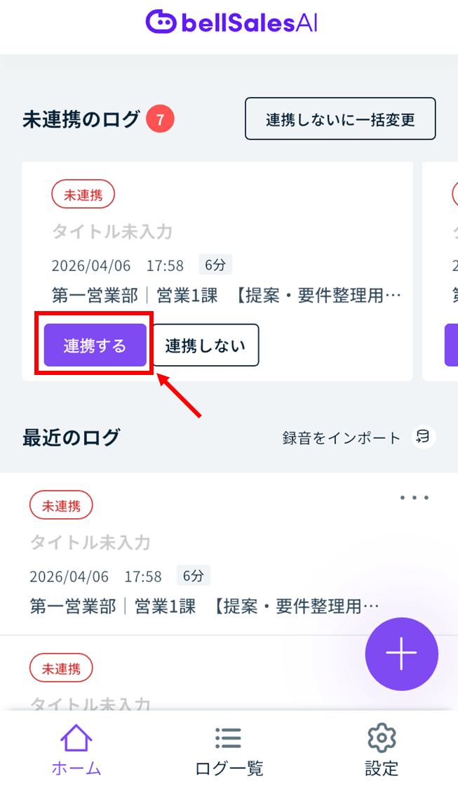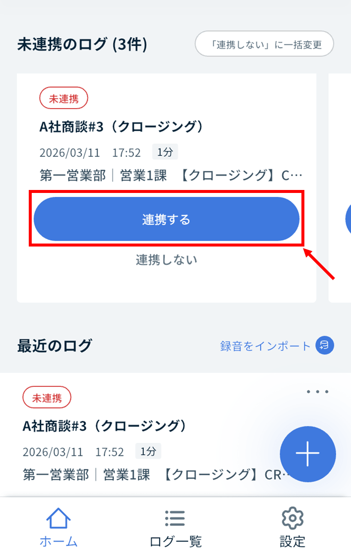PCブラウザ/スマホアプリにてログインし、「HOME(ホーム)」画面にて対象ログの[連携する]ボタンをクリック・タップします。