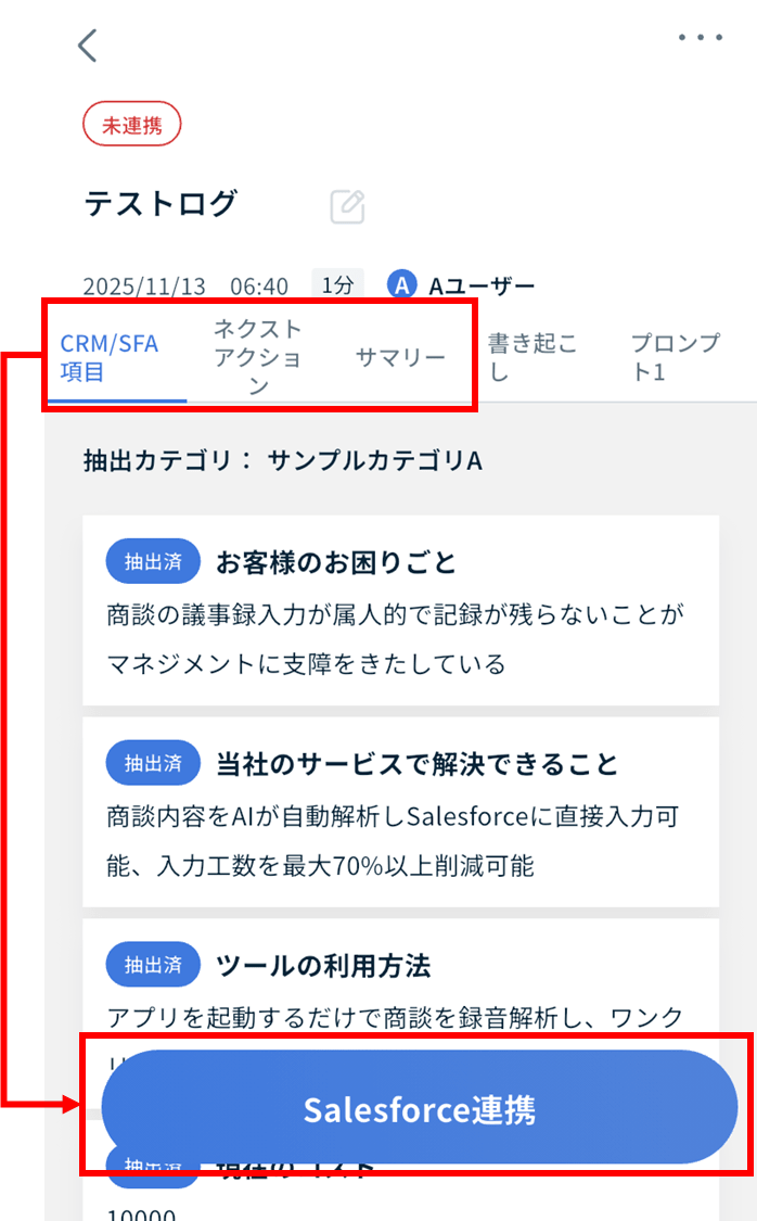 [CRM/SFA項目][ネクストアクション][サマリー]のいずれかのタブをタップし、画面の下部にある[Salesforce連携]ボタンをタップします。