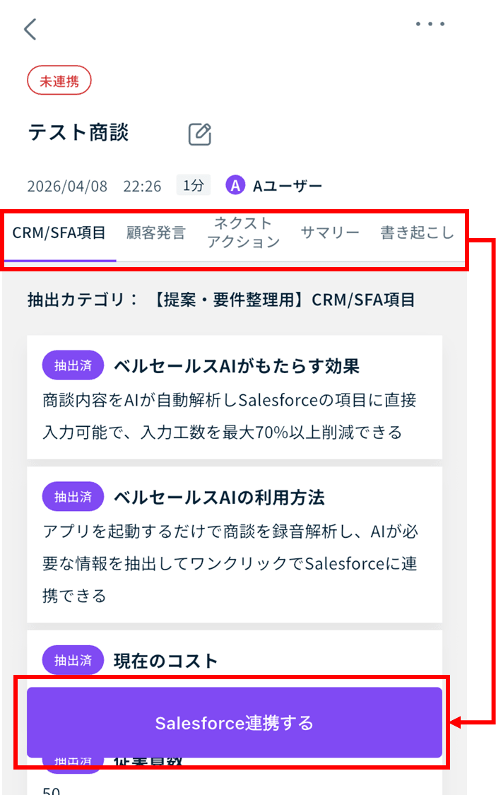 ※ Salesforce連携をおこなうためには、bellSalesAIとSalesforceのアカウント連携が必要です。