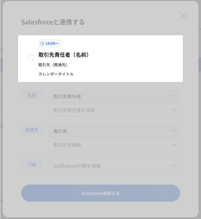 - 候補を選択し[Salesforce連携する]ボタンをクリック/タップすることで、「名前」「関連先」に紐づく新規の行動レコードが作成され、bellSalesAIのログ情報が連携されます。