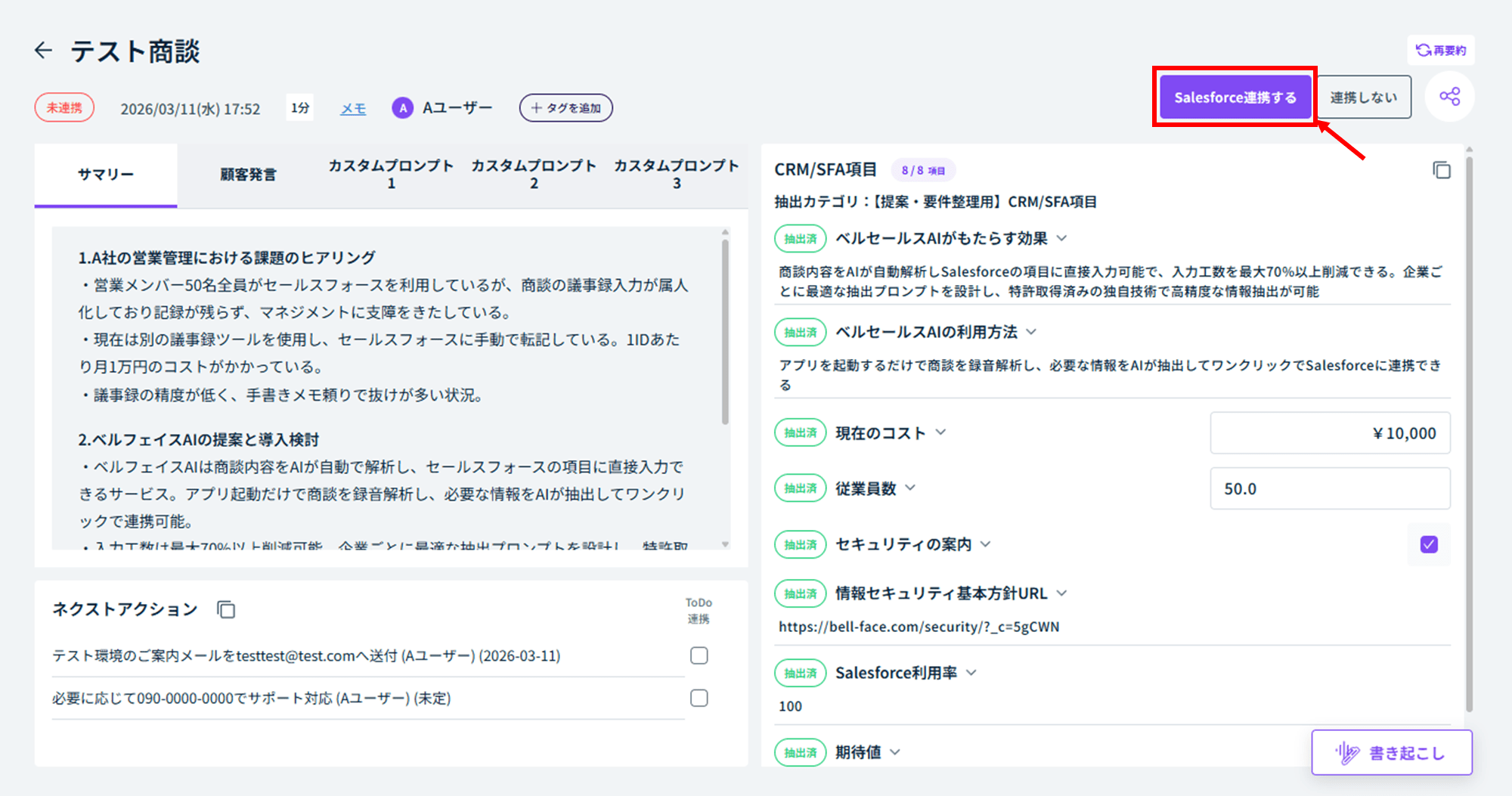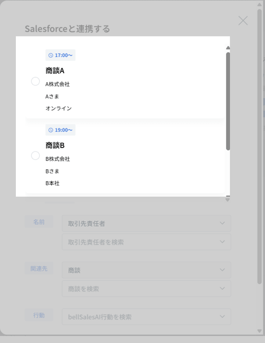 - Salesforce連携後に「bellSalesAI行動拡張」にネクストアクションを連携することはできないため、ご注意ください。