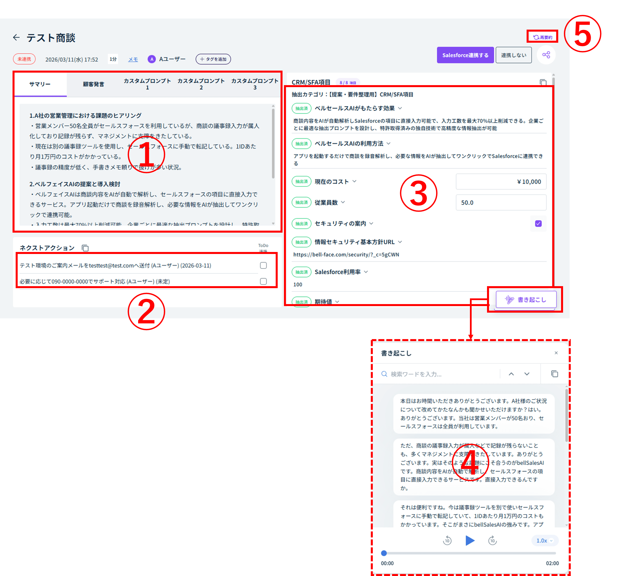 - 要約内容や書き起こしテキストなど、bellSalesAI側のログ情報を編集してからSalesforceに連携することができます。