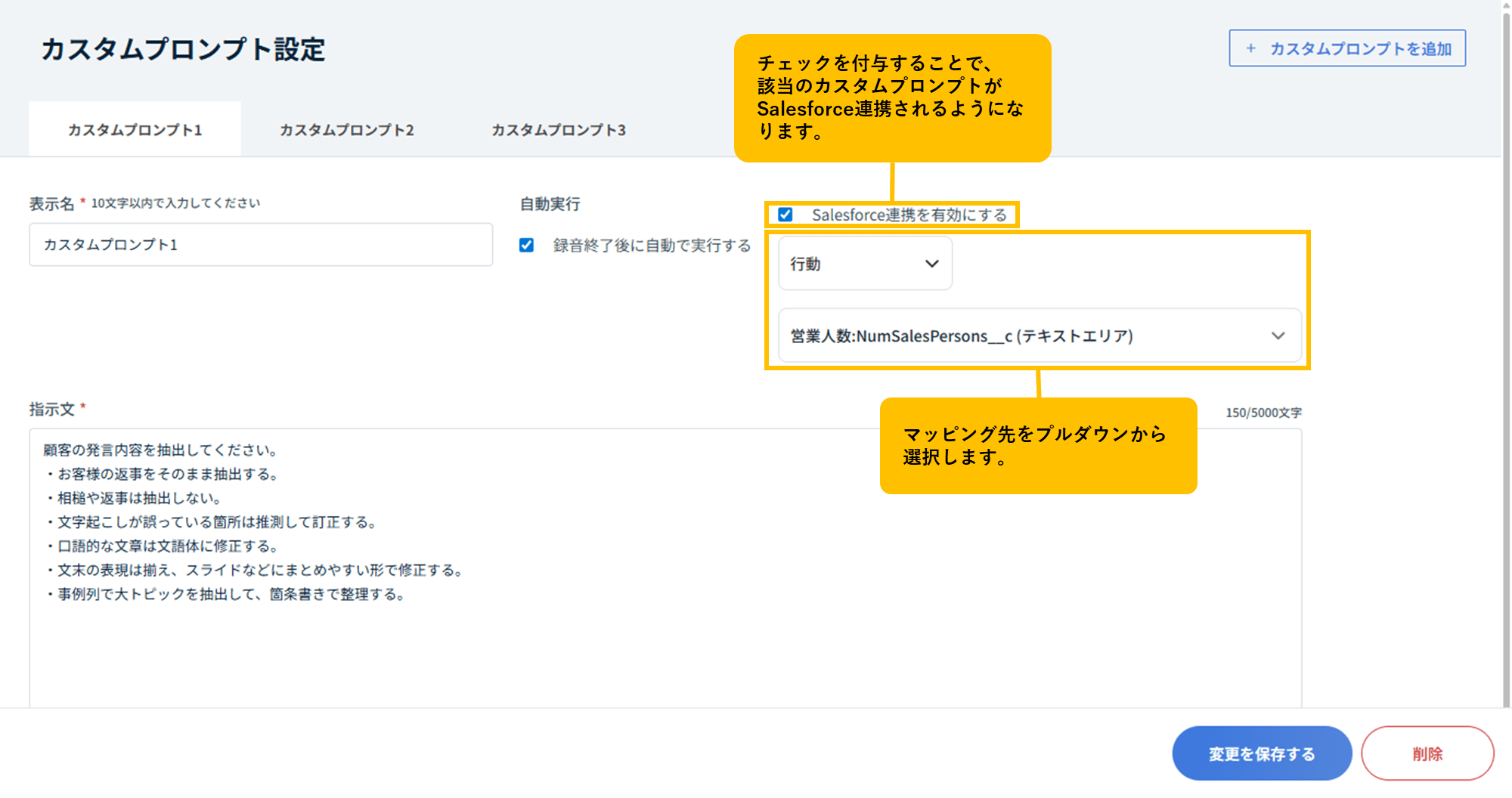 Salesforce連携時、カスタムプロンプトも連携が可能になりました。