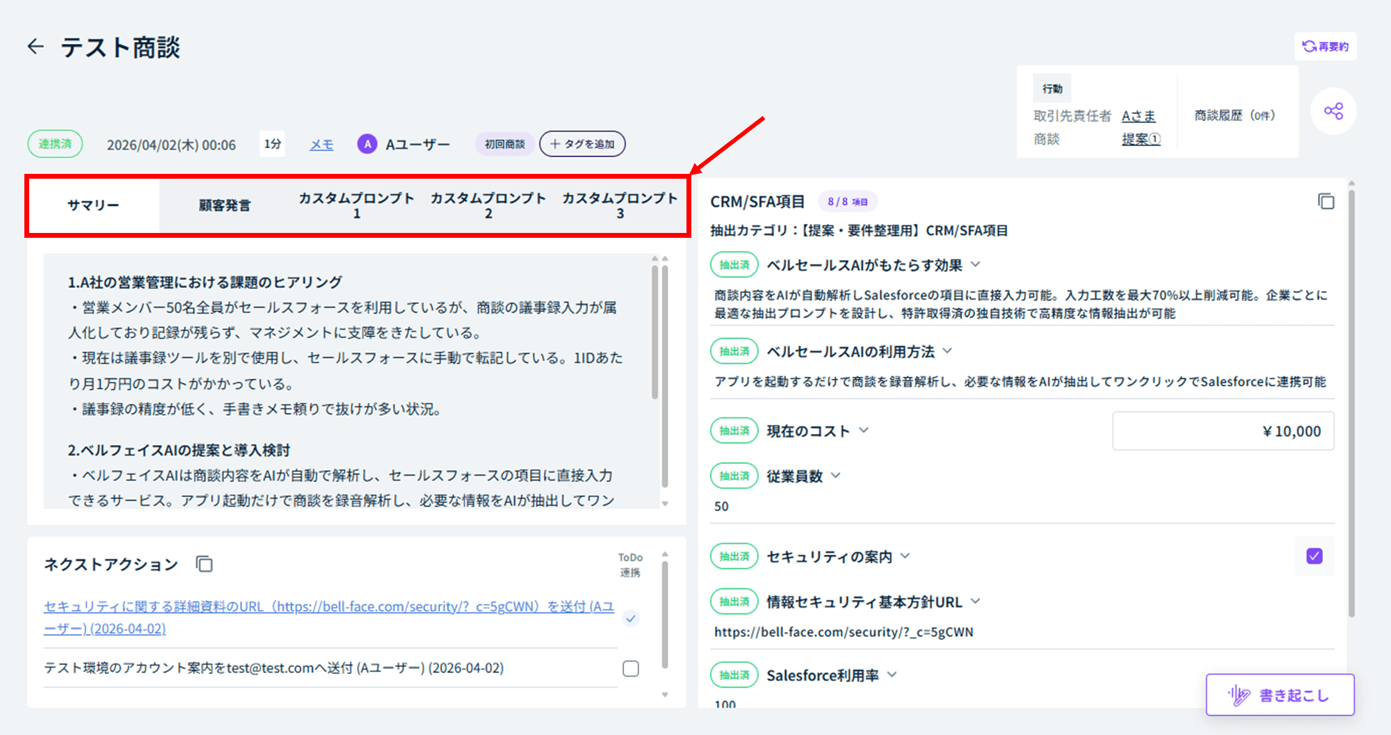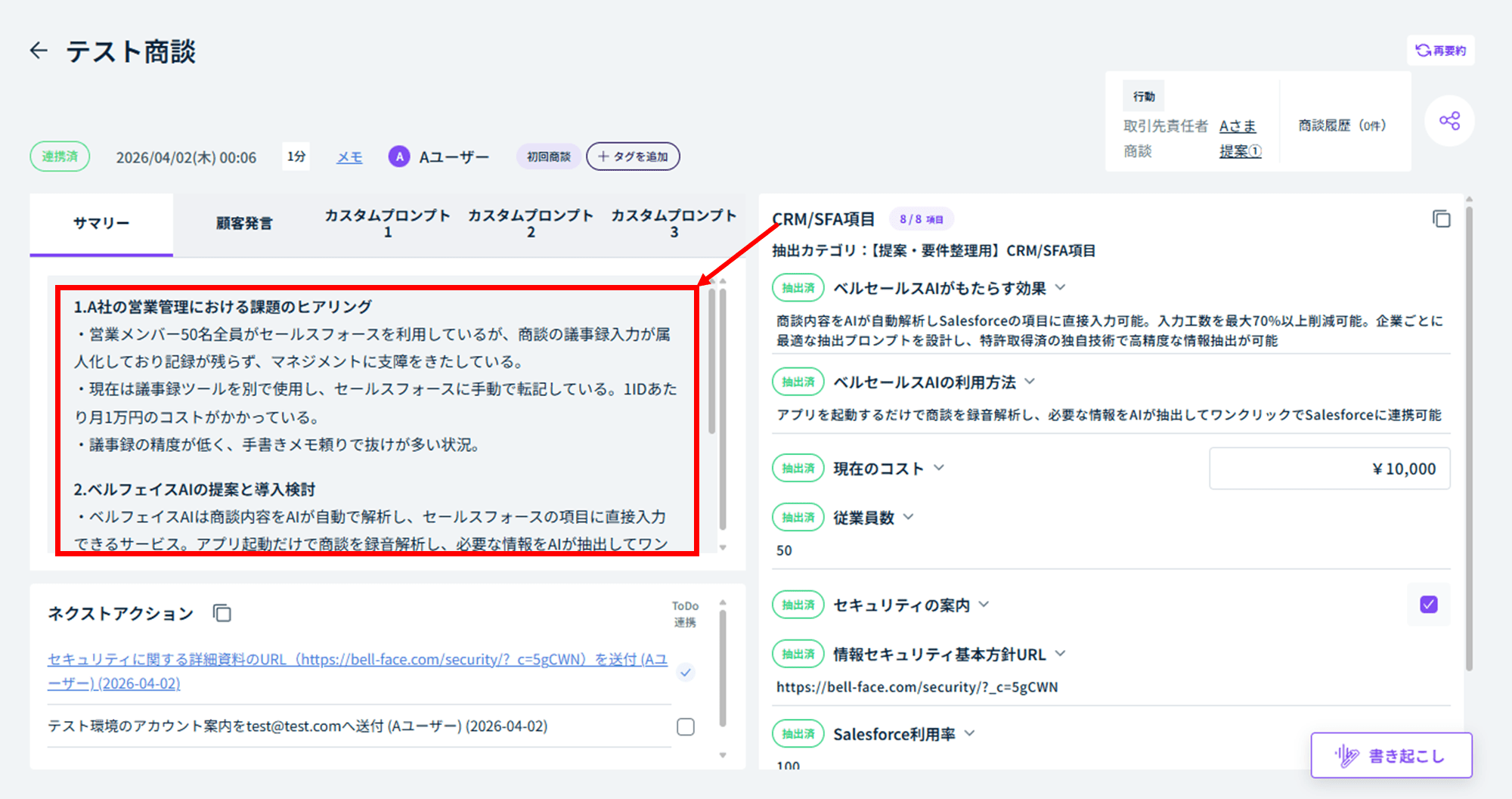 ここでは、AI抽出データ(サマリー/顧客発言/カスタムプロンプト)を編集する手順を解説します。