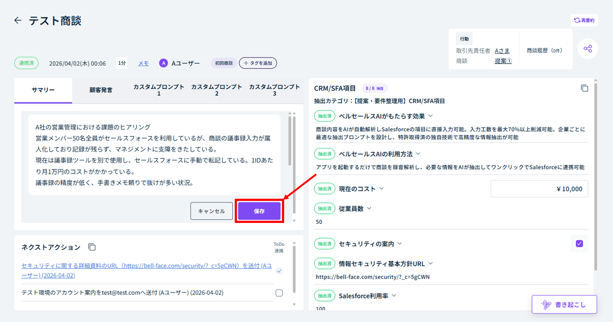 ログ詳細|AI抽出データ(サマリー/顧客発言/カスタムプロンプト)を編集する