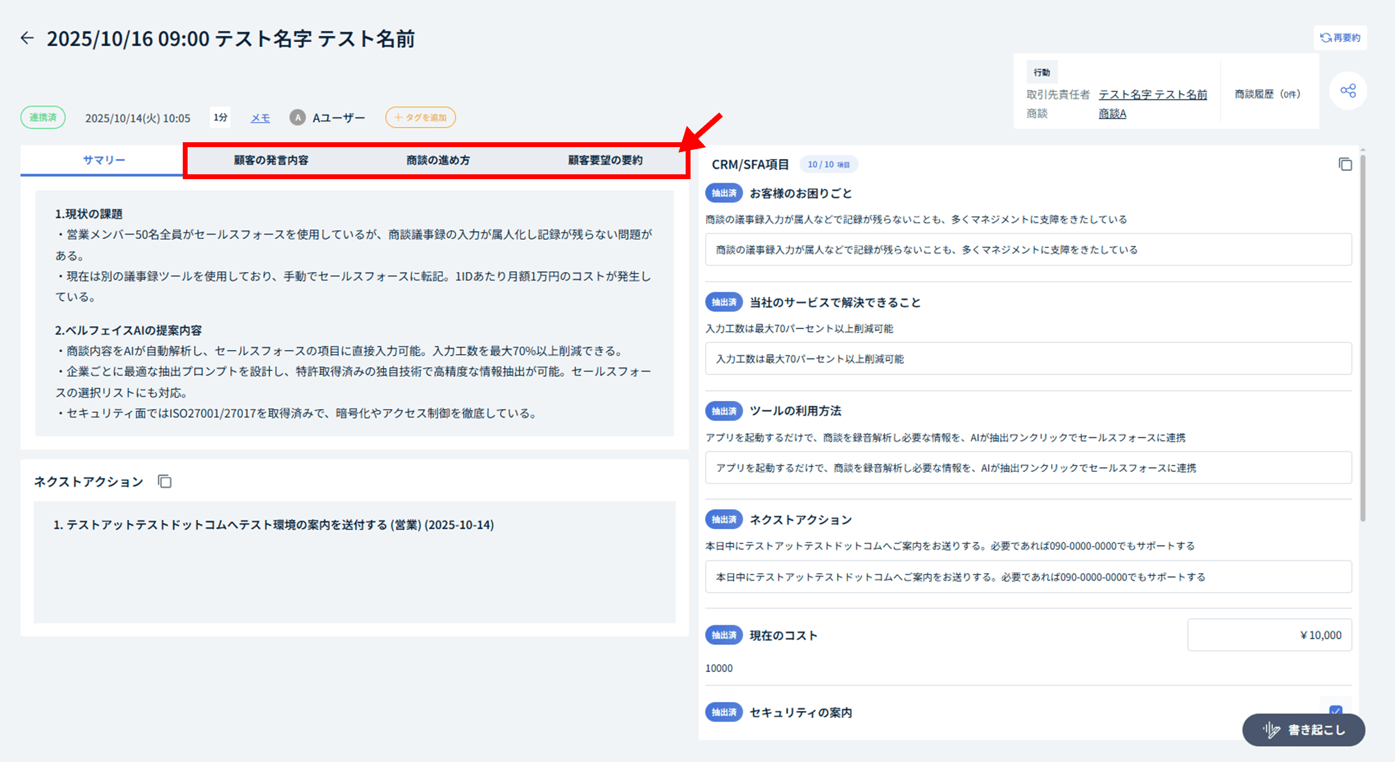 カスタムプロンプトの再要約をおこなうログの「ログ詳細」画面を開きます。