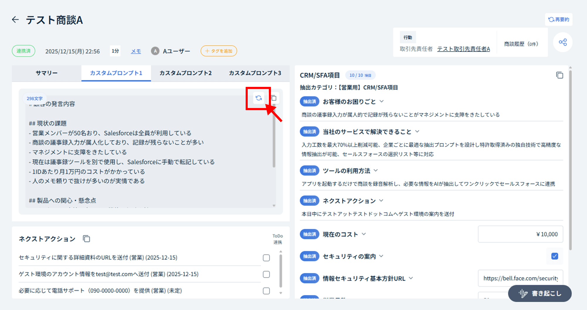 [再要約]ボタンをクリックすることで、選択中のカスタムプロンプトの再要約が実行されます。