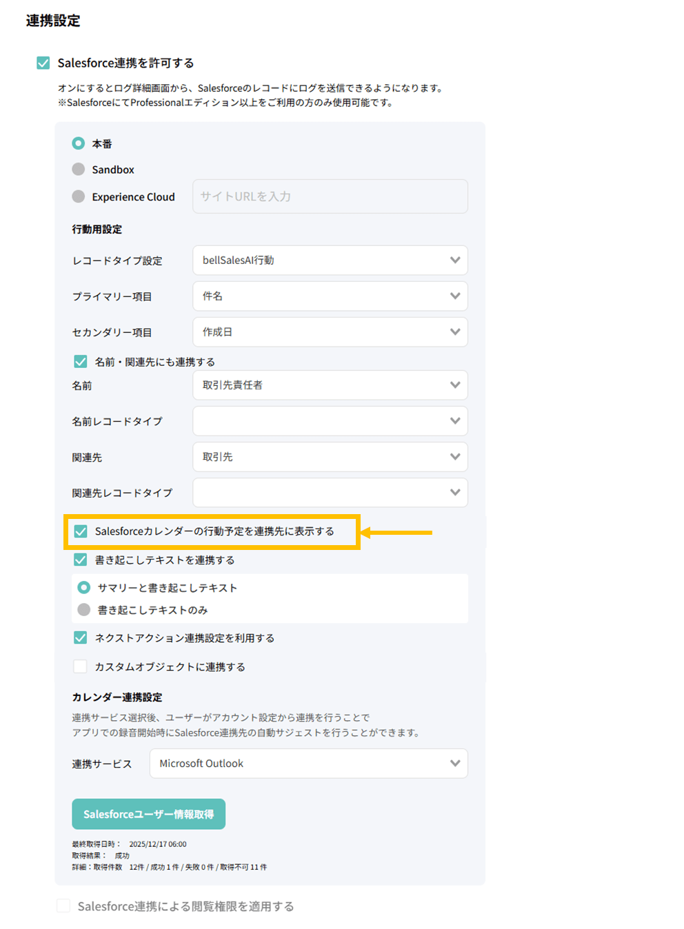 管理者の環境設定 > 「連携設定」に、「Salesforceカレンダーの行動予定を連携先に表示する」が追加されます。(デフォルトON)