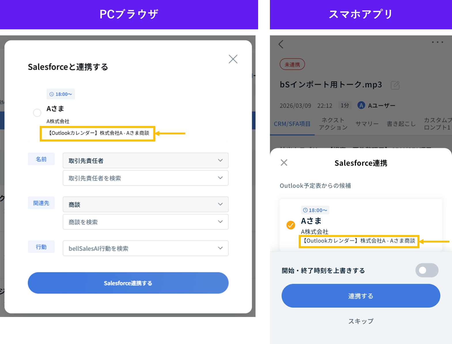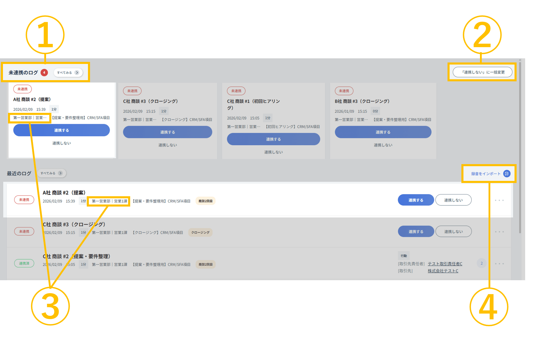 - クリック/タップにて確認モーダルが表示され、Salesforce未連携のログを一括で「連携しない」に変更することが可能になります。